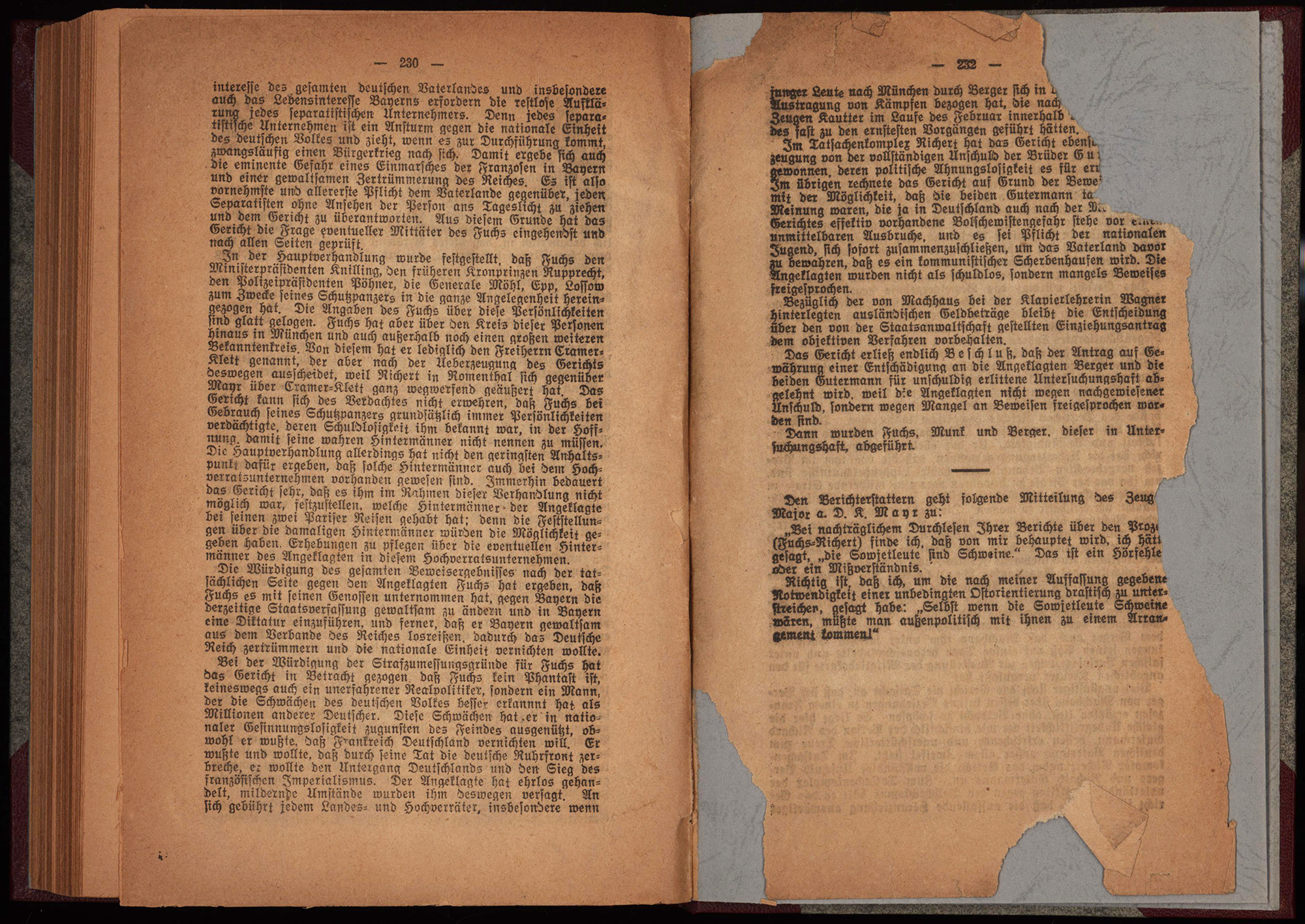 Bayerisch-deutsch oder bayerisch-französisch. Ein Sittenbild nationalaktiver Verwahrlosung. Der Hochverratsprozeß gegen Fuchs und Genossen vor dem Münchener Volksgericht im Juni 1923. München, Birk Verlag, 1923. 8°. 21,5 x 14,5 cm. 232 Seiten. Bibliothekseinband in Buckram mit marmoriertem Deckelbezug und aufkaschiertem Deckelschild.