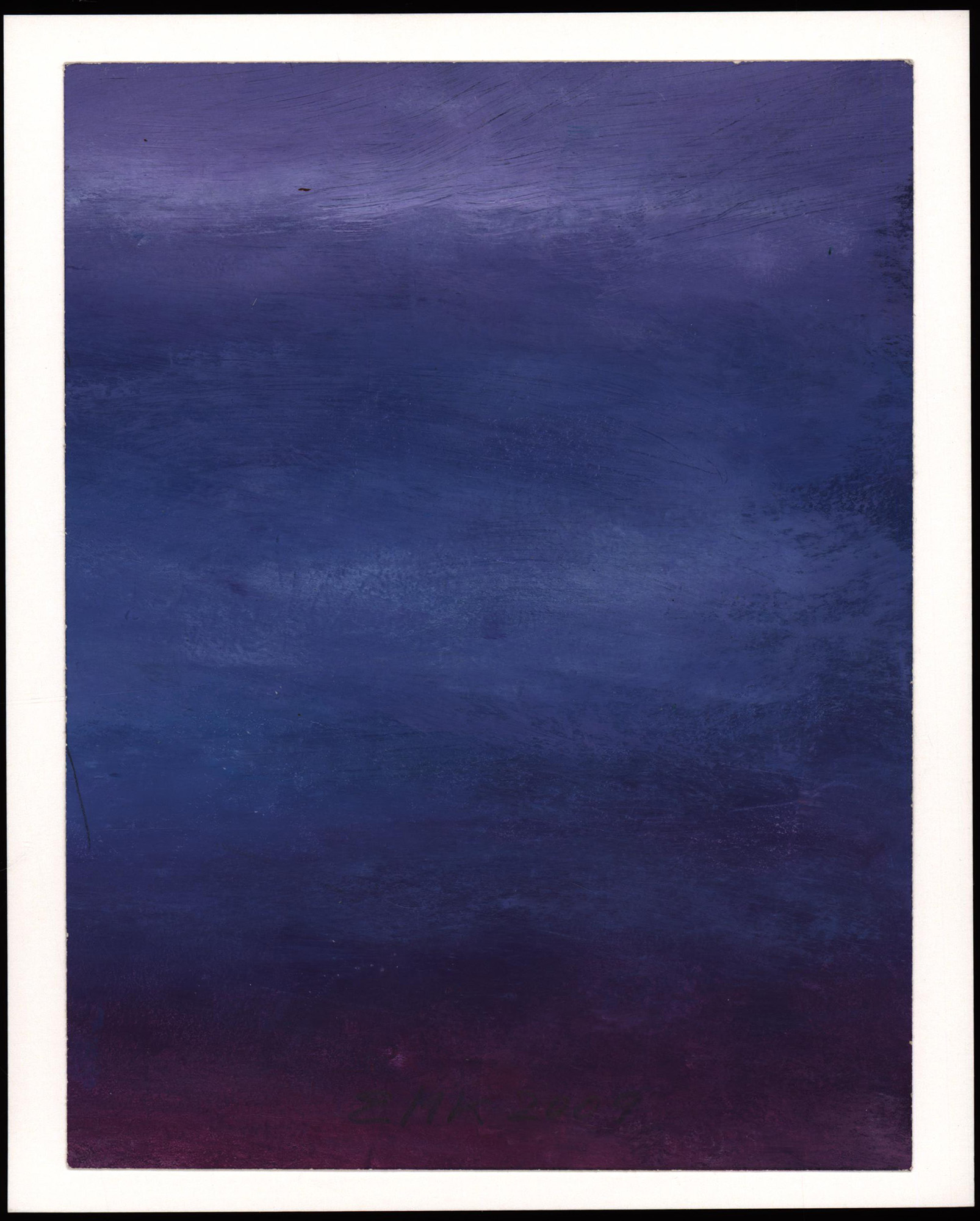 Original-Ölmalerei von Eva Maria Kentner in Blau- und Violetttönen auf Papier, im unteren Bildbereich mittig mit Bleistift signiert und datiert (2009). Auf Trägerpapier montiert. Maße Blatt/Gemälde: 19,3 x 14,9 cm. Maße Trägerpapier: 21,0 x 17,0 cm. Provenienz: Aus dem Nachlass des Kunstsammlers und Autors Ralf Seilheimer, mit seiner Inventarnummer auf der Rückseite der Fotografie und beiliegendem Karteiblatt seiner Sammlung. Sehr guter Zustand.