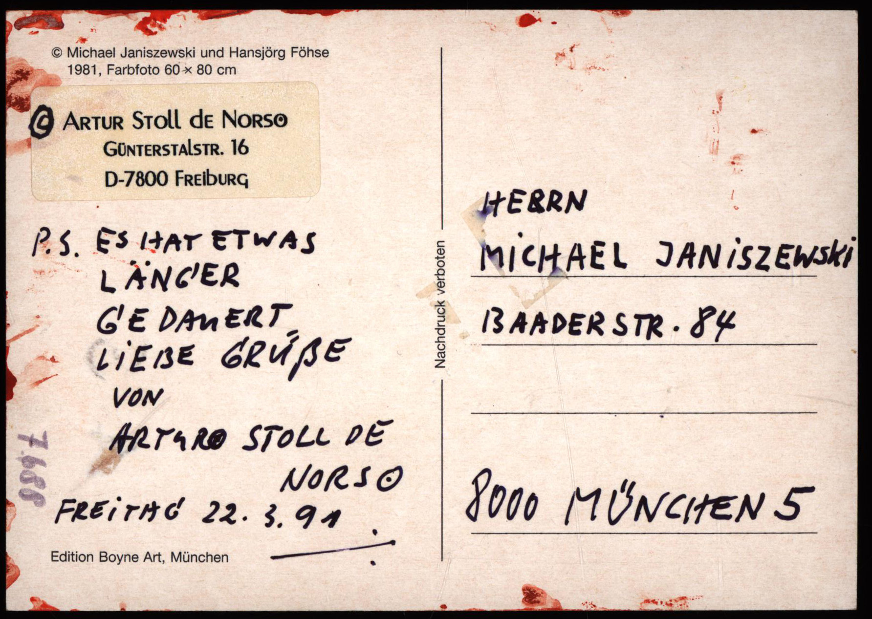Original-Collage mit Übermalung von Artur Stoll de Norso auf einer Postkarte, am oberen Rand mit blauem Kugelschreiber signiert und datiert (22. II. 91). Blatt rückseitig mit handgeschriebener, signierter Widmung von Artur Stoll de Norso an den Künstler Michael Janiszewski, datiert „Freitag 22.3.91“, dort mit leichten Farbspuren. Maße Blatt: 14,8 x 10,5 cm. Provenienz: Aus dem Nachlass des Kunstsammlers und Autors Ralf Seilheimer, mit seiner Inventarnummer auf der Rückseite der Karte und beiliegendem Karteiblatt seiner Sammlung. Insgesamt sehr guter Zustand.