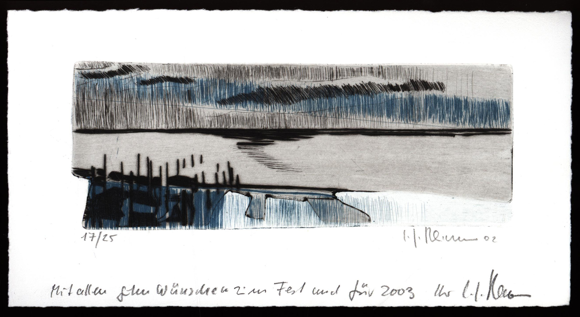 Nummer 17 von 25 Original-Farbradierungen von Carl-Heinz Kliemann in Schwarz und Blau auf Büttenpapier, unterhalb der Abbildung mit Bleistift signiert und datiert (’02). Am unteren Rand mit zusätzlich signierter handschriftlicher Widmung mit Neujahrsgrüßen 2003 mit Bleistift. Maße Blatt: 11,4 x 21,8 cm. Maße Abbildung: 6,5 x 17,0 cm. Provenienz: Aus dem Nachlass des Kunstsammlers und Autors Ralf Seilheimer, mit seiner Inventarnummer auf der Rückseite und beiliegendem Karteiblatt seiner Sammlung. Sehr guter Zustand.
