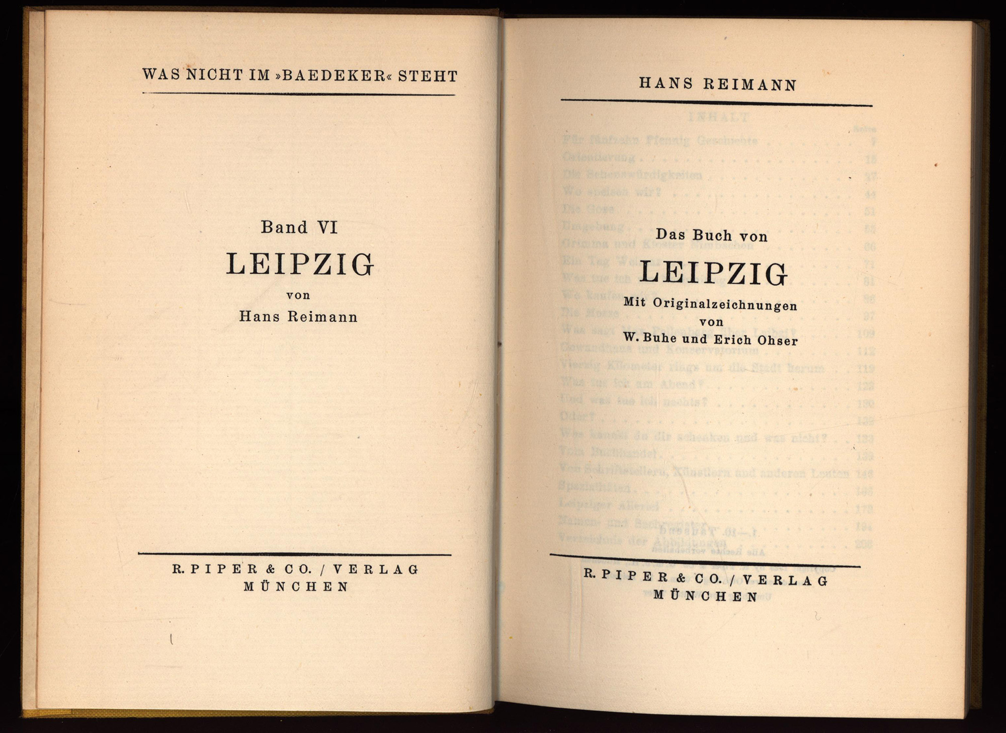 Reimann, Hans: Das Buch von Leipzig. Mit Originalzeichnungen von W. Buhe und Erich Ohser. München, Piper Verlag, 1929. 8°. 18,5 x 12,5 cm. 206 Seiten. Original-Leinenband. (= Was nicht im „Baedeker“ steht, Band 6).
