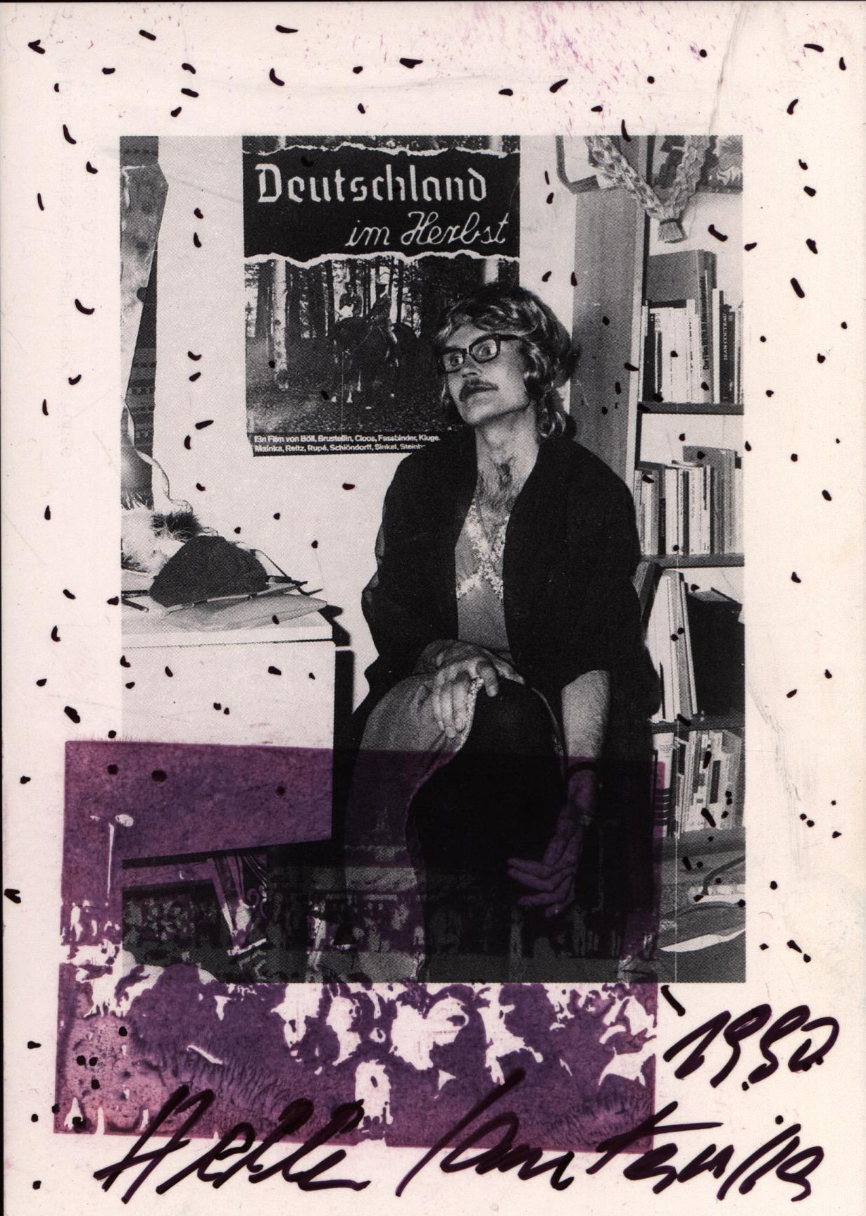 Original-Zeichnung von Hella Santarossa, Übermalung mit schwarzem Filzschreiber auf einer Postkarte mit dem Motiv „Deutschland im Herbst“ von Michael Janiszewski und Hansjörg Föhse, Edition Boyne, München, vorderseitig im unteren Bildbereich von Martina Kügler mit schwarzem Filzschreiber signiert und datiert (1990). Provenienz: Aus dem Nachlass des Kunstsammlers und Autors Ralf Seilheimer, mit seiner Inventarnummer auf der Rückseite und beiliegendem Karteiblatt seiner Sammlung. Sehr guter Zustand.