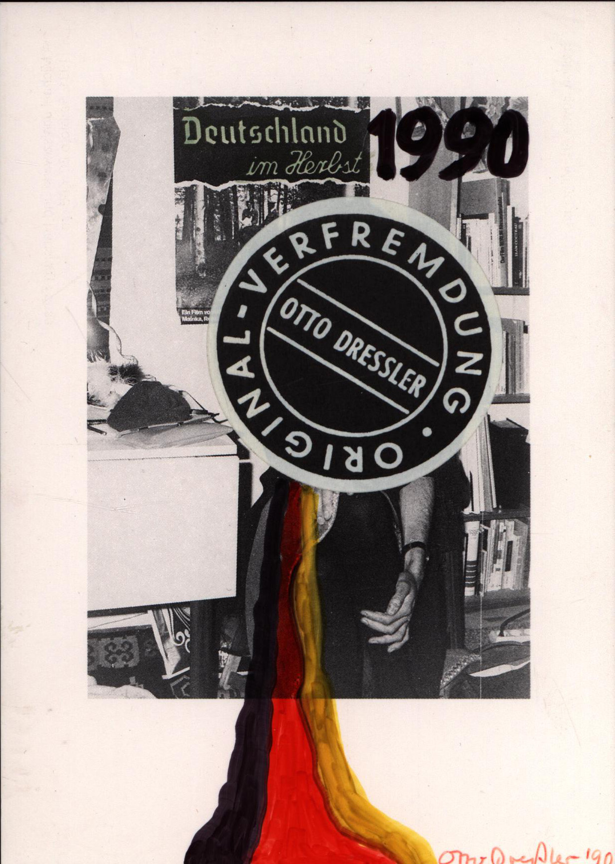 Original-Zeichnung von Otto Dressler, Übermalung mit farbigen Filzschreibern und einem Aufkleber „Original-Verfremdung“ auf einer Postkarte mit dem Motiv „Deutschland im Herbst“ von Michael Janiszewski und Hansjörg Föhse, Edition Boyne, München, vorderseitig unten rechts von Otto Dressler in Orange signiert und datiert (’90), rückseitig mit einem handgeschriebenen, signierten Gruß von Otto Dreßler. Provenienz: Aus dem Nachlass des Kunstsammlers und Autors Ralf Seilheimer, mit seiner Inventarnummer auf der Rückseite und beiliegendem Karteiblatt seiner Sammlung. Sehr guter Zustand.