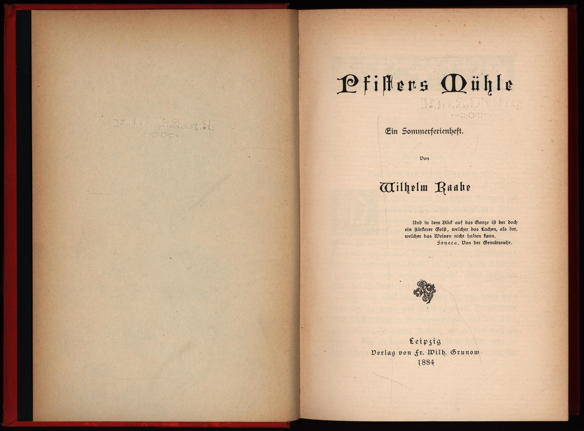 Raabe, Wilhelm: Pfisters Mühle. Ein Sommerferienheft. [Erste Ausgabe]. Leipzig, Grunow Verlag, 1884. 8°. 19 x 14 cm. 277 Seiten. Original-Leinenband mit goldgeprägtem Rücken- und Deckeltitel und floraler Deckelillustration.