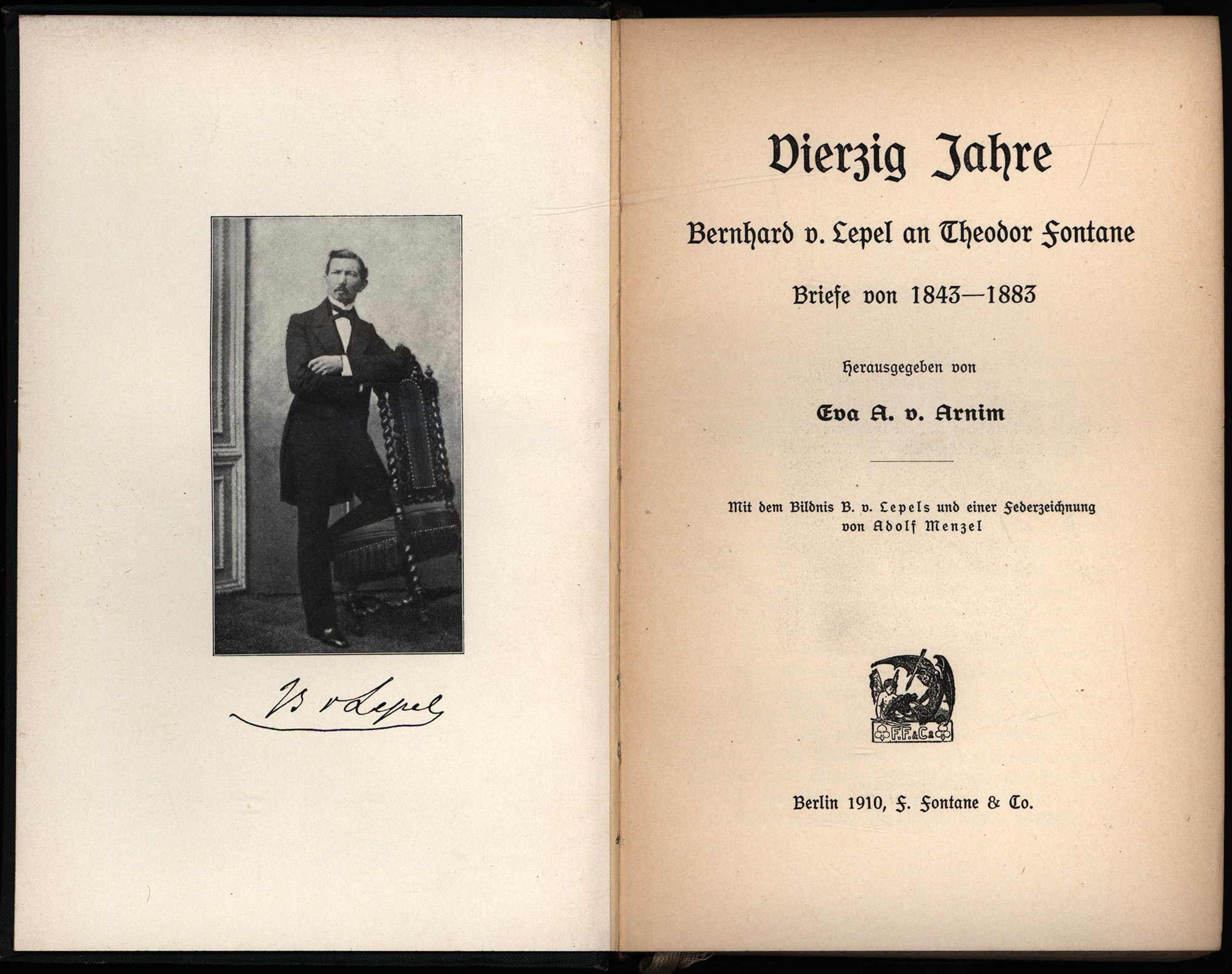 Lepel, Bernhard von – Arnom, Eva A. v. (Hrsg.): Vierzig Jahre. Bernhard v. Lepel an Theodor Fontane. Briefe von 1843 – 1883. Berlin, Fontane Verlag, 1910. 8°. 20 x 13,5 cm. VIII, 435 Seiten. Original-Leinenband mit reicher Goldprägung auf Rücken und Deckel und mit Rundum-Marmorschnitt.