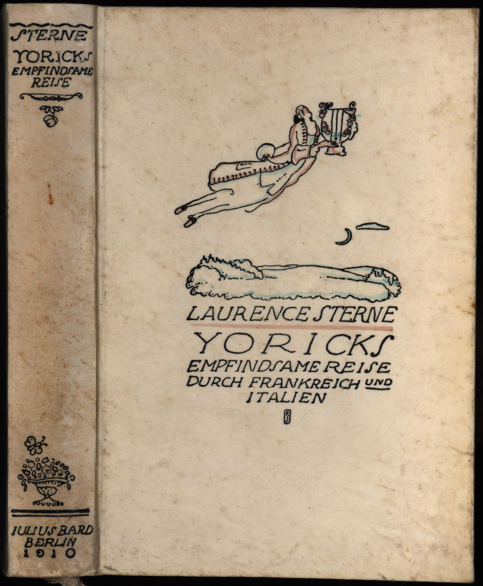 Sterne, Laurence: Yoricks empfindsame Reise durch Frankreich und Italien. Berlin, verlegt von Julius Bard, 1910. Klein-8°. 17,5 x 12 cm. [2], 266 Seiten, [1] Blatt. 12 Tafeln. Original-Pergamentband mit schwarzem Rücken- und Deckeltitel, farbiger Deckelillustration, Lesebändchen und Rundum-Gelbschnitt.