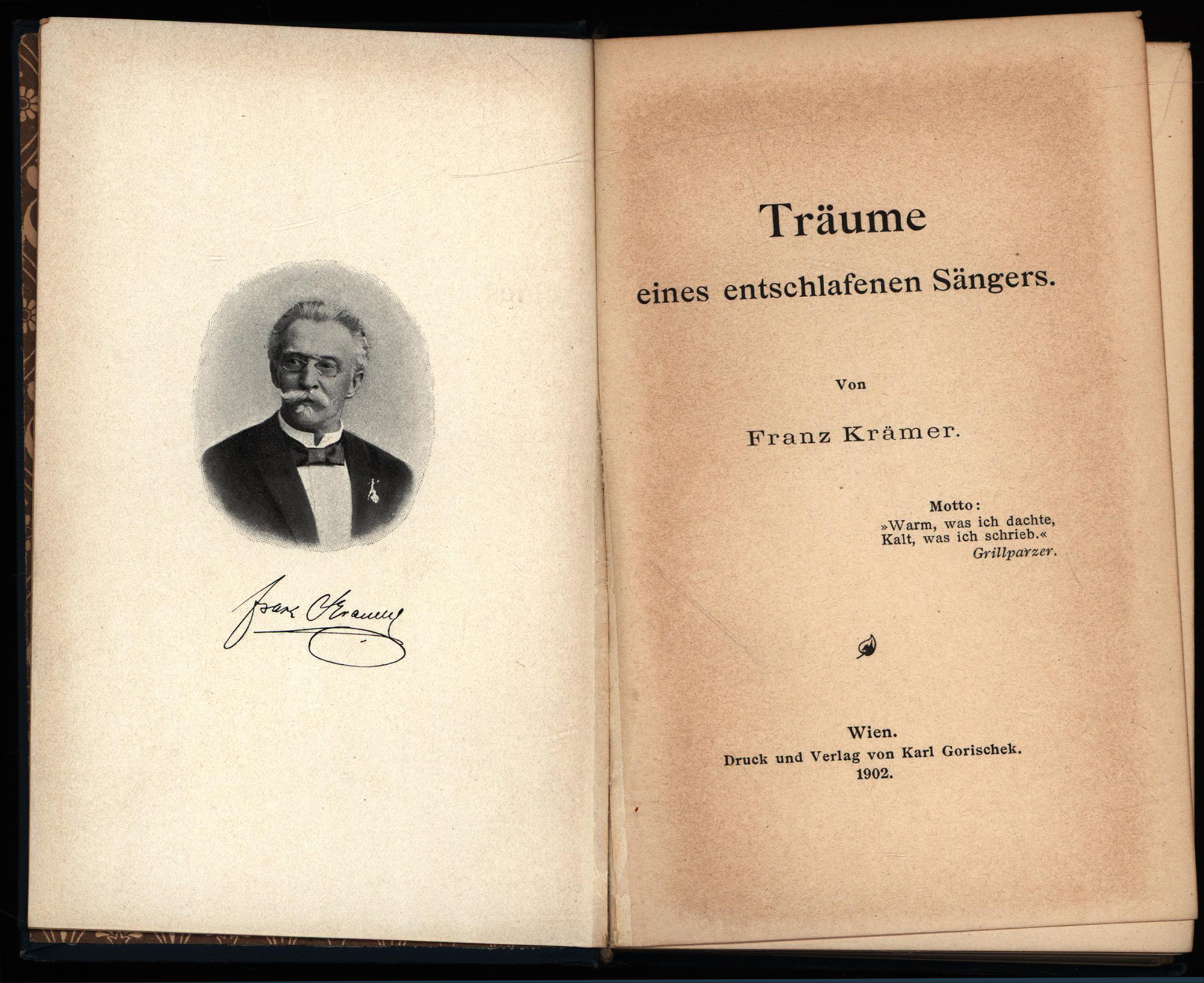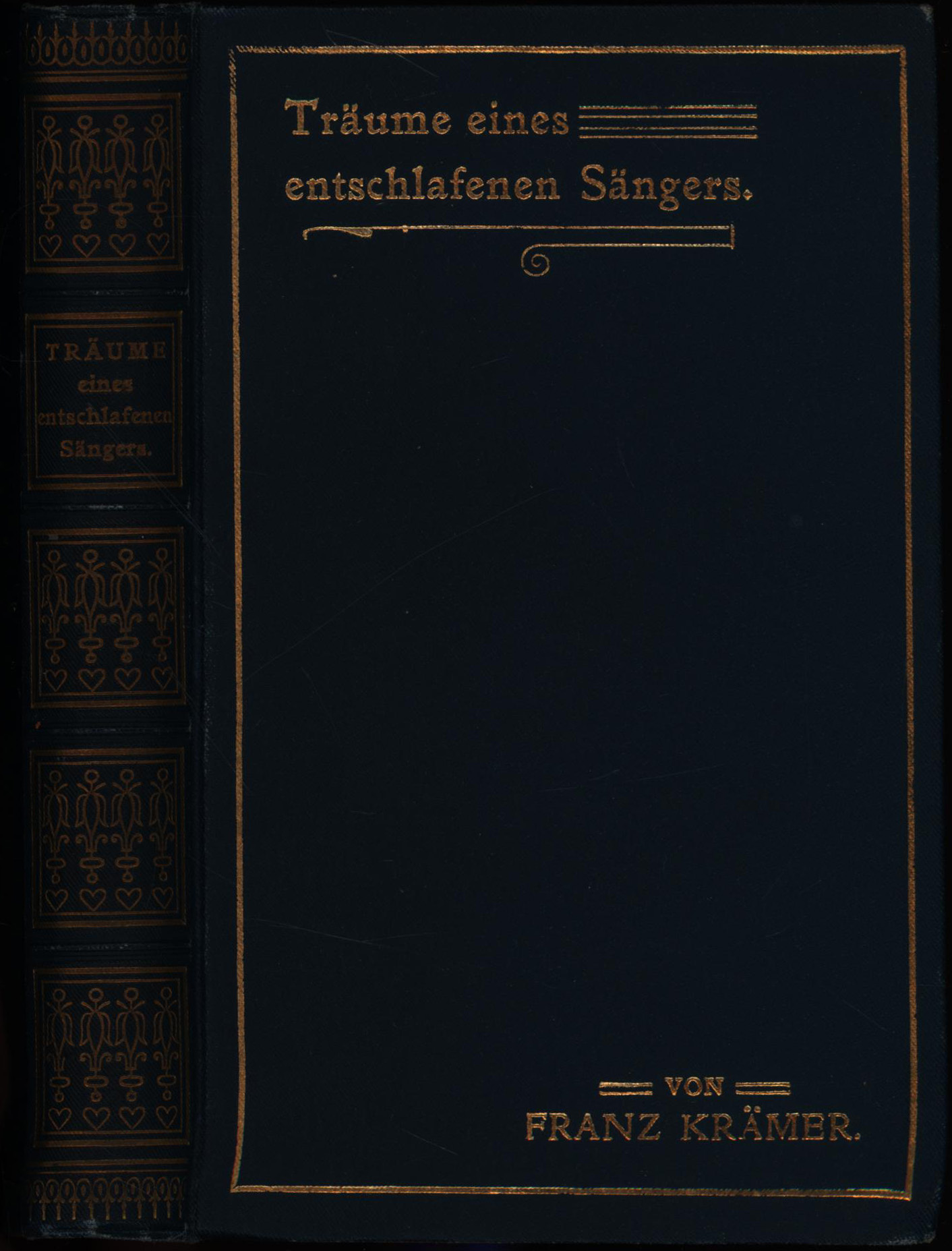 Krämer, Franz: Träume eines entschlafenen Sängers. Wien, Verlag Karl Gorischek, 1902. Klein-8°. 15,5 x 10 cm. 279 Seiten. Original-Leinenband mit reicher Rückenvergoldung, goldgeprägtem Deckeltitel, illustrierten Vorsätzen und Rundum-Goldschnitt.