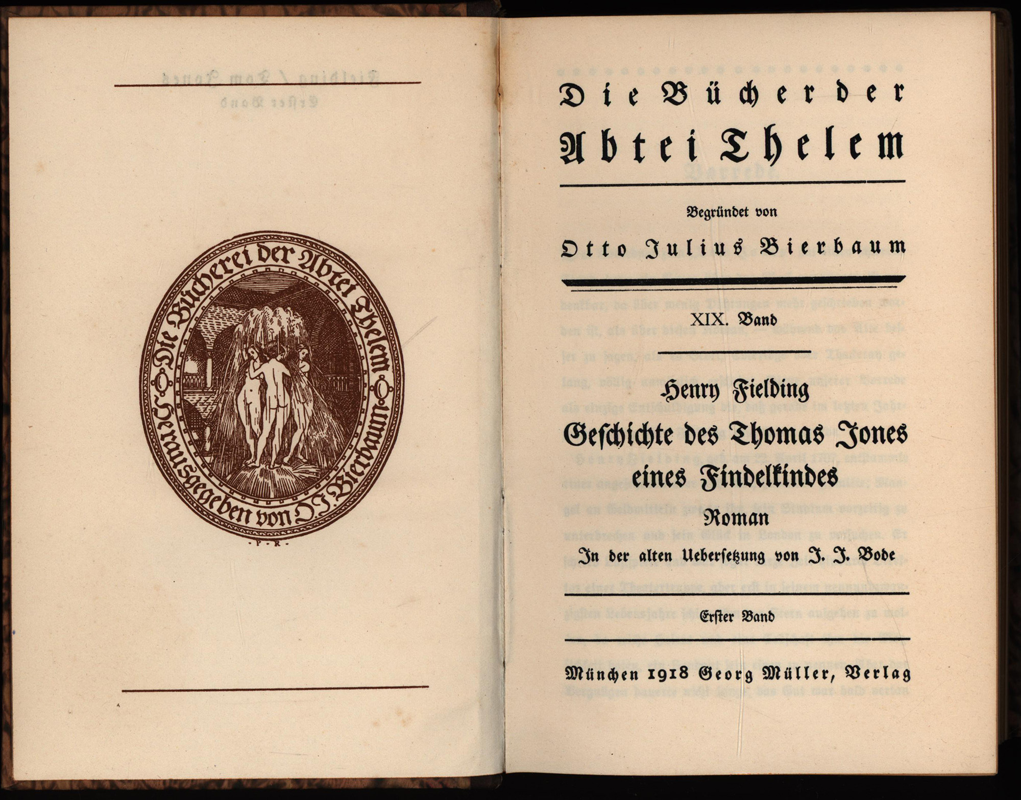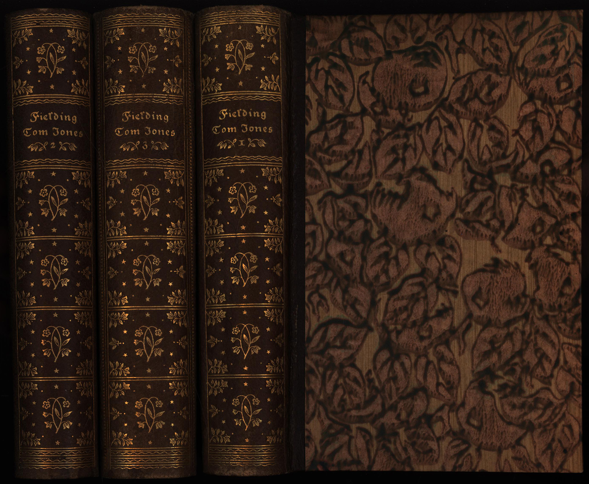 Fielding, Henry: Geschichte des Thomas Jones eines Findelkindes. Roman. In der Übersetzung von J.J. Bode. 3 Bände (komplett). München, Georg Müller Verlag, 1918. 8°. 19 x 13 cm. X, 412; 435; 553 Seiten. Original-Halblederbände mit floraler Rückenvergoldung, marmoriertem Deckelbezug und Rundum-Gelbschnitt. (= Die Bücher der Abtei Thelem, Band 19-21).
