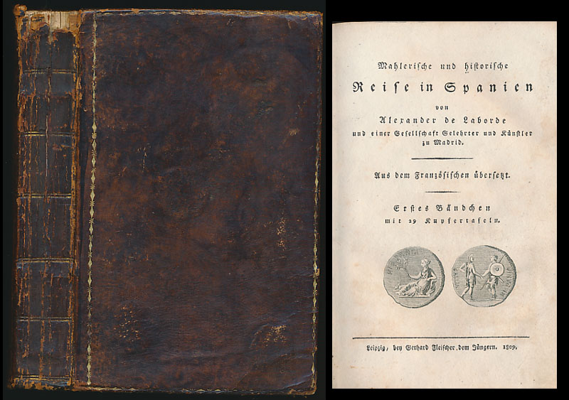 Laborde, Alexandre de: Mahlerische und historische Reise in Spanien. Aus dem Französischen übersetzt. Erstes Bändchen mit 29 Kupfertafeln. Leipzig, bey Gerhard Fleischer dem Jüngeren 1809. Klein-8°. 15 cm. XXXV, 210 Seiten. 26 Kupfertafeln. Ganzlederband der Zeit.