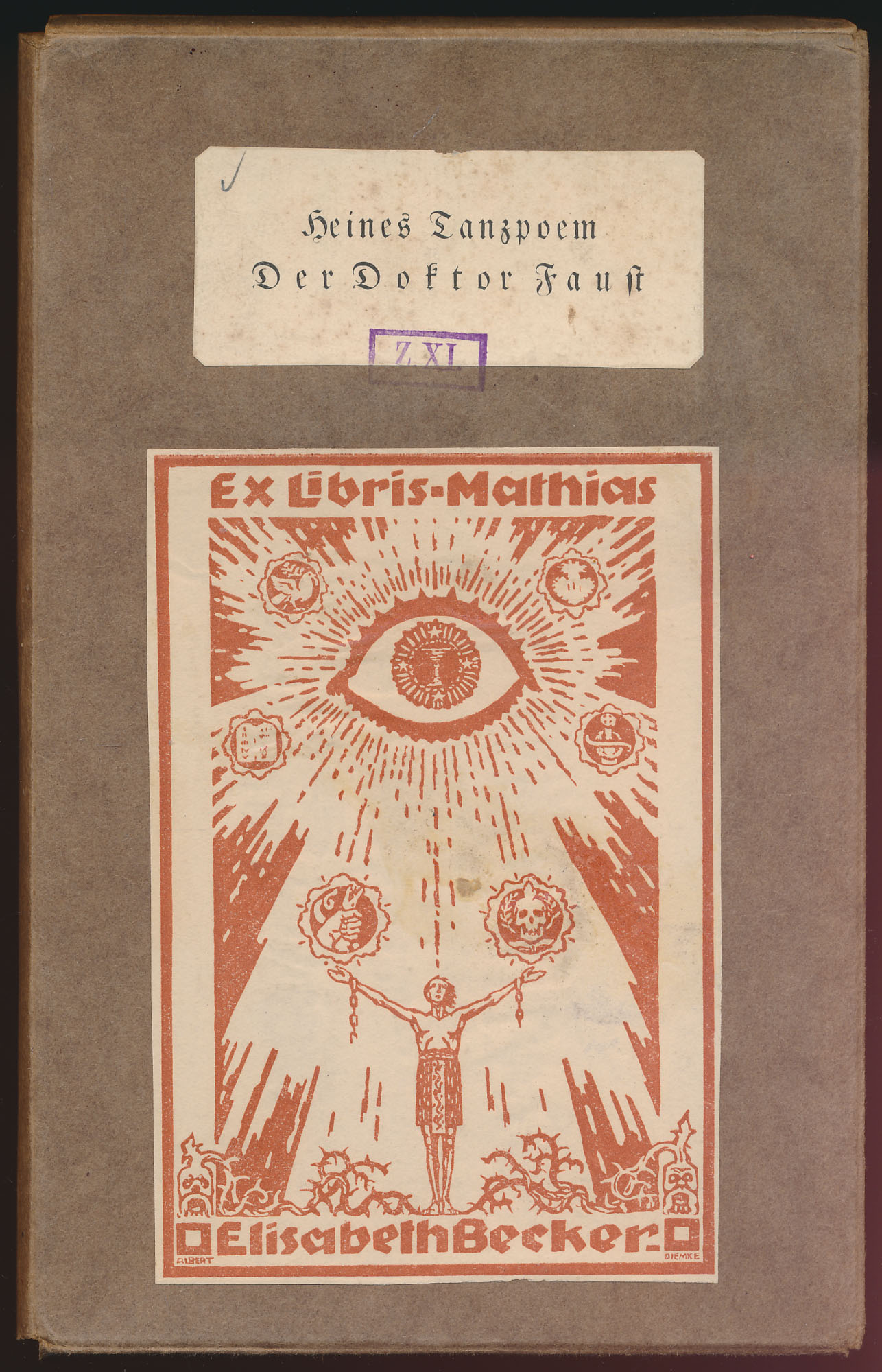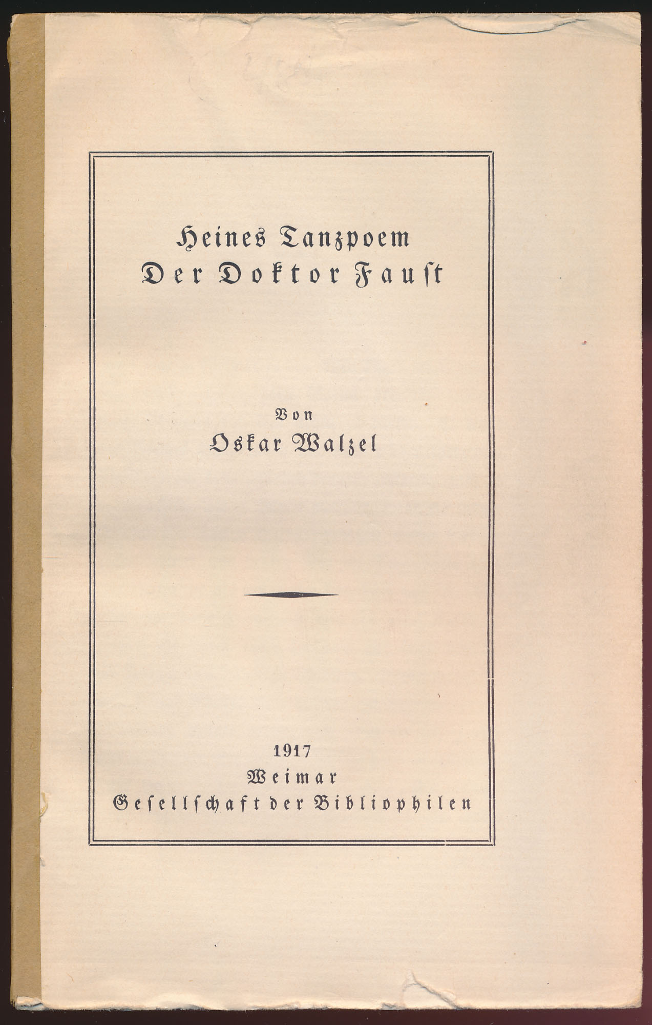 Erste Ausgabe, zweiter Druck. Wilpert/Gühring 22. Mit dem 47-seitigen Begleitheft „Heines Tanzpoem. Der Doktor Faust“ von Oskar Walzel, Weimar, Gesellschaft der Bibliophilen, 1917. Mit Schmutztitel, Verlagsanzeige und Anzeige vom „Bildniß von Heinrich Heine“ von Adolph Hornemann (letztes Blatt). Druck von H. Hotop in Cassel. Die Restauflage dieser Ausgabe wurde 1917 von der Gesellschaft der Bibliophilen als Jahresgabe ausgegeben (mit dem oben genannten Begleitheft). Exlibris auf Kartonmappe. Heine-Broschur ohne (!) den Umschlag mit der lithografierten Illustration nach Georg Spiller von Hauenschild und mit gelöstem Vortitel, Randläsuren, duchgehend leicht stockfleckig, unaufgeschnitten. Noch gutes Exemplar mit gutem bis sehr gutem Begleitheft.