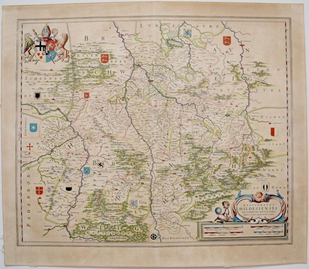 Altkolorierter Original-Kupferstich von 1645 von Johannes Michael Gigas, aus dem „Theatrum Orbis Terrarum, sive Atlas Novus“ von Willem und Johann Bleau. Rechts unten mit ausgemalter figurativer Kartusche, links oben großes koloriertes Wappen von Hildesheim, Wälder, Flüsse, Städte und vor allem die kleinen Stadtwappen in altem Kolorit. Rückseitig Text in Latein. Maße Blatt: 48,5 x 55,5 cm. Maße Platte/Abbildung: 41,5 x 50,0 cm. Rückseitiger Randbereich mit Spuren ehemaliger Montage im Rahmen, mit Resten von Klebeband. Gutes bis sehr gutes Exemplar.