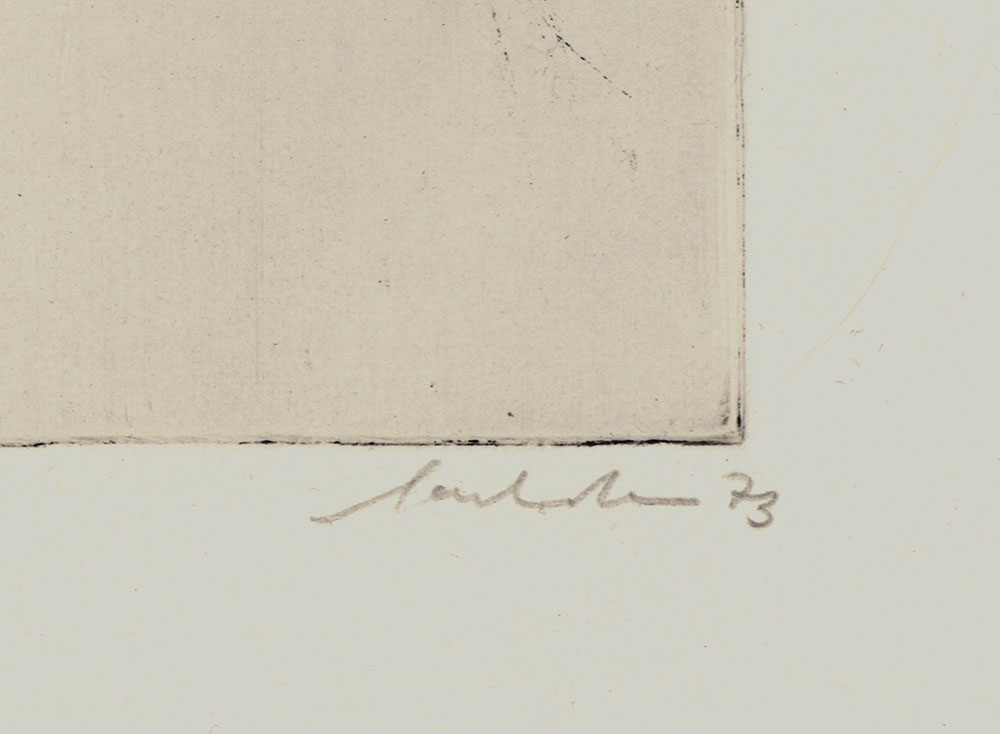 Original-Radierung auf Büttenpapier, von Rolf Sackenheim unterhalb der Abbildung in Blei signiert, datiert (73) und mit „I-3“ bezeichnet (1. Zustand, 3 Exemplare). Maße Abbildung/Platte: 16,0 x 24,6 cm. Maße Blatt: 26,8 x 39,5 cm. Provenienz: Aus der Sammlung des Düsseldorfer Sammlerpaares Ruth und Johannes Schreiber. Sehr gutes Exemplar.