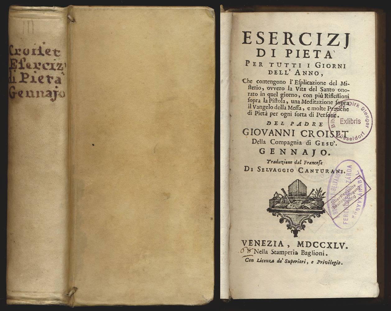 Croiset, Jean: Esercizj Di Pietà Per Tutti I Giorni Dell’Anno. Che contengono l’Esplicazione del Mistero; ovvero la Vita del Santo onorato in quel giorno, con più Riflessione sopra la Pistola, una Meditazione sopra il Vangelo della Messa, e molte Pratiche di Pietà per ogni sorta di Persone [1. Band]: Gennajo. Venezia (Venedig), Nella Stamperia Baglioni, 1745. Klein-8. 17 x 9 cm. 549 [1] Seiten. Pergamentband der Zeit mit handschriftlichem Rückentitel. Jean Croiset, geboren am 28. August 1656 in Marseille, gestorben am 31. Januar 1738 in Avignon. Französischer katholischer Priester, Jesuit, Autor aszetischer Schriften und früher Verbreiter der Herz-Jesu-Verehrung.