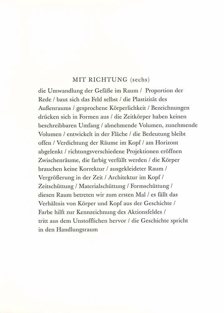 Walther, Franz Erhard: Zerfall des Sockels. Werkbau. Die Bilder sind im Kopf. [6 Signierte Original-Farboffsetdrucke / 6 signed original color offset prints]. Blatt 1: Mit Richtung (sechs). Blatt 2: Über Arm. Blatt 3: Sammelobjekt (neun). Blatt 4: Plastisch. Blatt 5: 10 x Ort Strecke Ort. Blatt 6: Zeit Stelle Dauer Richtung Bezug. Franz Erhard Walther, geboren am 22. Juli 1939 in Fulda. Deutscher Bildhauer, Konzept-, Installations- und Prozesskünstler.