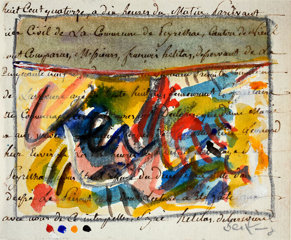 Becking, Horst: Abstrakte Komposition. Übermalung. 13.8.1988. [Original-Aquarell auf alter Handschrift, signiert / original watercolor on old manuscript, signed]. Horst Becking, geboren am 14. Januar 1937 in Hagen. Deutscher Maler, seit 1964 Mitglied des Westdeutschen Künstlerbundes. Studium 1971 bis 1977 an der Staatlichen Kunstakademie Düsseldorf, zunächst in der Klasse von Joseph Beuys, nach dessen Ausscheiden bei Rupprecht Geiger.