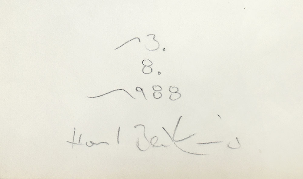 Original-Aquarell auf alter Handschrift, diese auf Büttenkarton fixiert. Von Horst Becking unterhalb der Abbildung signiert und datiert. Rückseitig Original-Radierung „Im schönen Sauerland“, unterhalb der Abbildung von Horst Becking, datiert, signiert und mit Widmung an einen Sammler versehen. Maße Aquarell: 8,5 x 10,5 cm. Maße Blatt: 32,5 x 25,7 cm. Blatt wenig angestaubt, Randbereich minimal gedunkelt. Noch sehr guter Zustand.