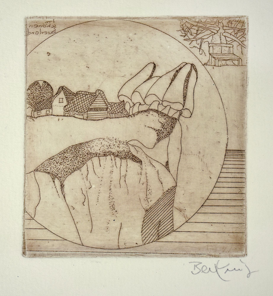 Original watercolor on old manuscript, fixed on laid paper. Signed and dated by Horst Becking below the image. Verso original etching „Im beautiful Sauerland“, below the illustration by Horst Becking, dated, signed and dedicated to a collector. Dimensions watercolor: 8.5 x 10.5 cm. Sheet dimensions: 32.5 x 25.7 cm. Sheet slightly dusty, marginal area slightly darkened. Still very good condition.