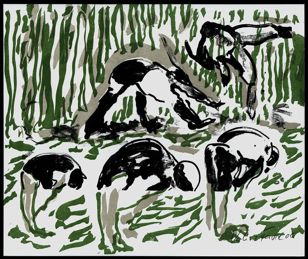 6 Original-Farblithografien auf Alt Nürnberg Bütten-Papier, 270 g/qm. Drucker: Tabor-Presse, Berlin. Komplette Serie „Salto“. Jedes Blatt unterhalb der Abbildung von Valerie Favre in Blei signiert und datiert (06). Maße Blatt/Abbildung (variierend): 21,0 x 25,0 (bis 42,0 x 28,0) cm. Herausgegeben von der Griffelkunst-Vereinigung, Hamburg, 2006. Griffelkunst, Verzeichnis der Editionen 321 B1-B6. Sehr guter, tadelloser Zustand.