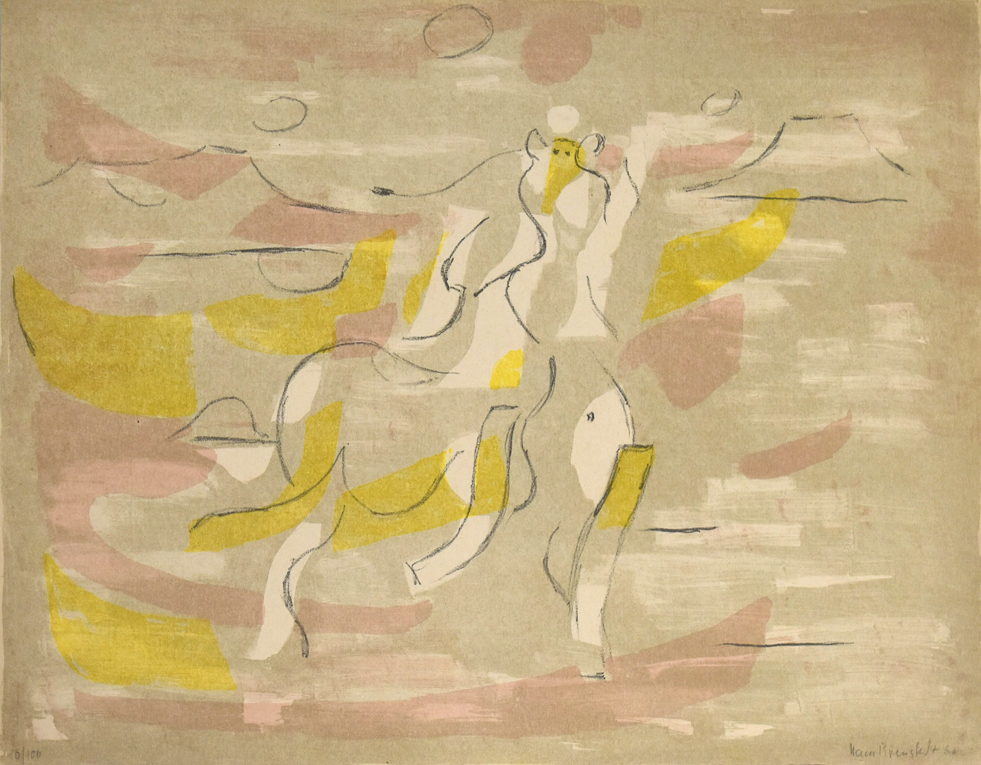 Number 10 of 100 numbered original color lithographs on thick paper. Signed and dated (60) in lead by Hans Breustedt below the image. Dimensions sheet/image: 39.0 x 50.0 cm. Provenance: From the estate of the art collector and author Ralf Seilheimer. Paper slightly bent in some areas in the margins. Still a very good copy.