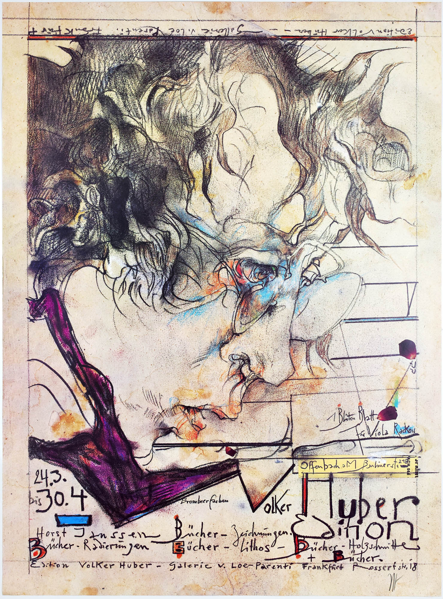 Original-Plakat (Farboffsetdruck) auf weißem Papier. Von Horst Janssen unterhalb der Abbildung in Blei signiert. Plakat zur Janssen-Ausstellung in der Volker Huber/Edition/Galerie von Leo-Parent, Frankfurt März-April 1977. Werkverzeichnis Meyer-Schomann Nr. 67. Maße Blatt: 76 x 56 cm. Rückseitig mit wenigen Stockflecken. Noch sehr gutes Exemplar.