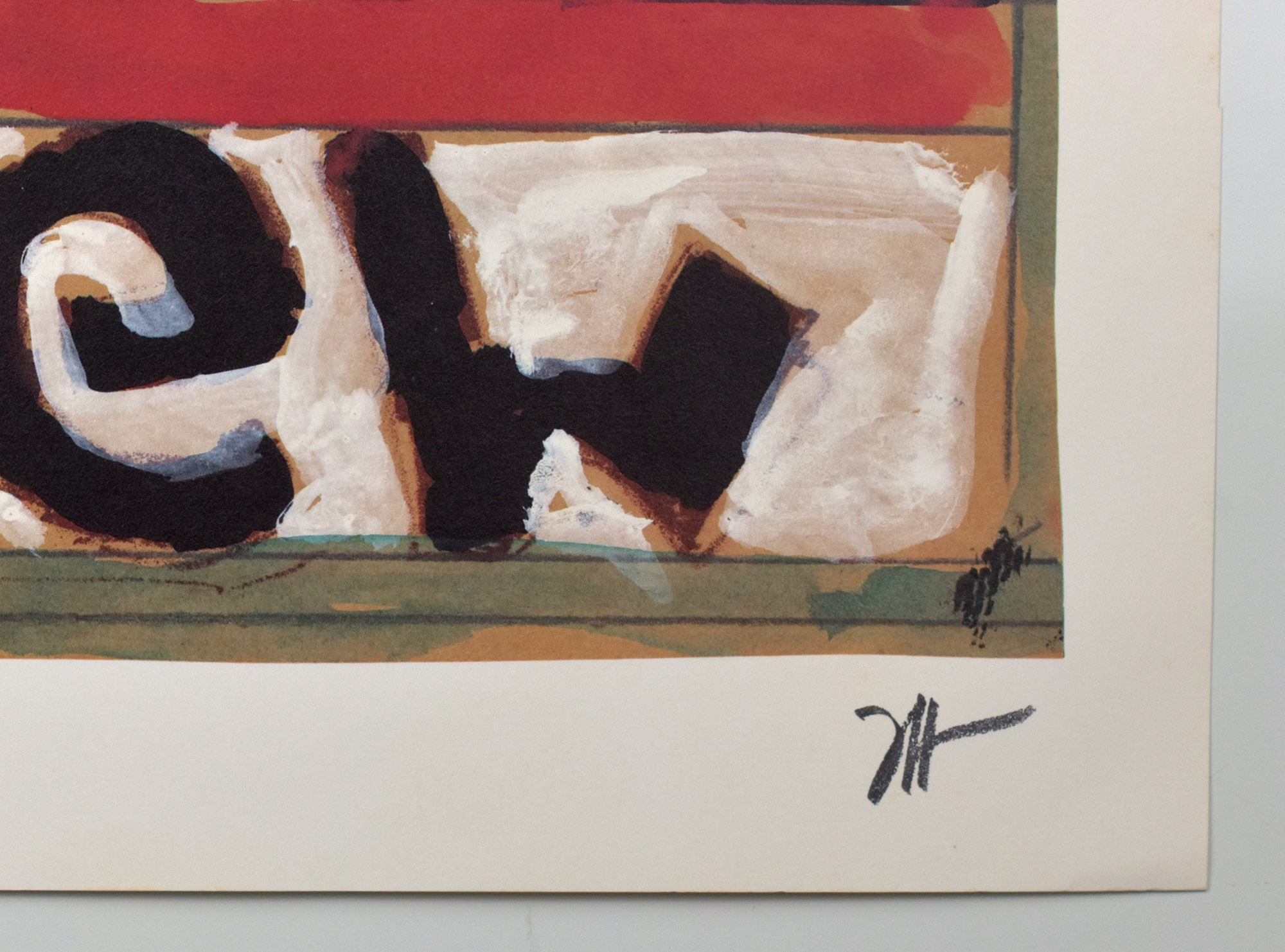 Original-Plakat (Farboffsetdruck) auf weißem Papier. Unterhalb der Abbildung mit Stempelsignatur von Horst Janssen. Herausgegeben von der Galerie St. Gertrude, Hamburg. Rückseitig typografisch beschrifet. Nicht im Werkverzeichnis Meyer-Schomann. Maße Blatt: 63 x 48,5 cm. Rückseitig wenig fleckig. Noch sehr gutes Exemplar.