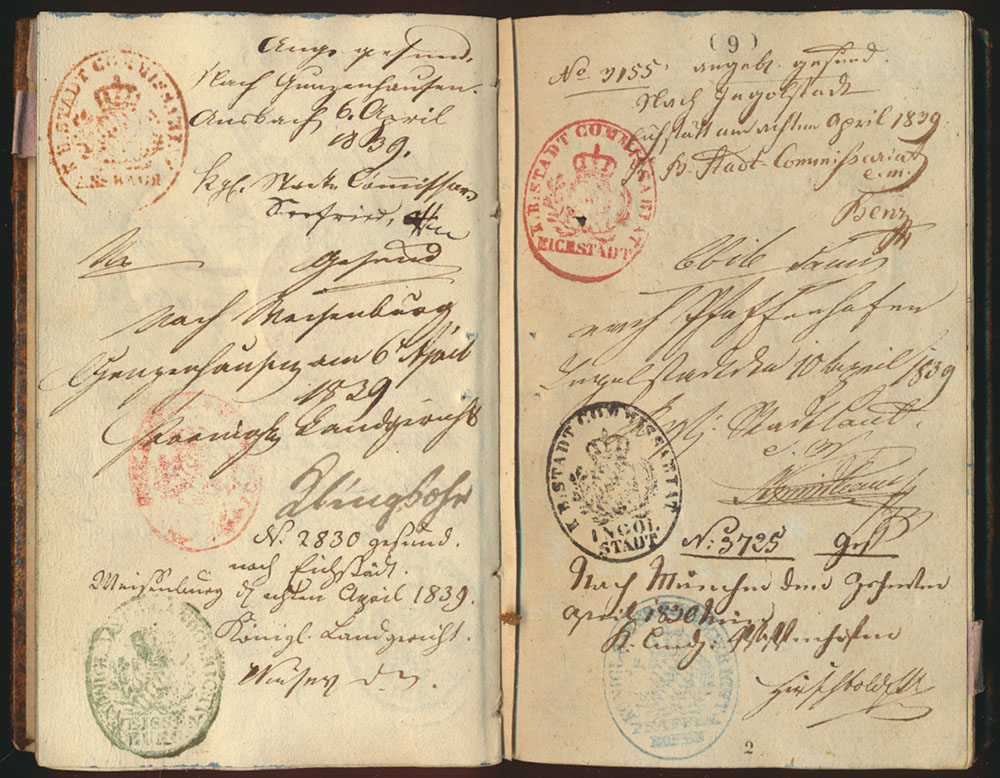 Wanderbuch für Handwerksgesellen. Ausgestellt 1835. Enthält einen Auszug aus den „allerhöchsten Verordnungen (Das Wandern der Handwerker betr.). Mit 38 Einträgen, unter anderem aus Aschaffenburg, Ochsenfurt, Eichstädt, Ingolstadt und Landsberg aus den Jahren 1835-1840. Alle Einträge mit dem jeweiligen städtischen Siegel versehen. Einband leicht berieben, Vorderdeckel leicht aufgebogen. Gutes Exemplar.