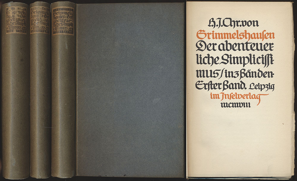 Grimmelshausen, Hans Jakob Christoffel von: Der abenteuerliche Simplicissimus. In 3 Bänden (komplett). Leipzig, Insel-Verlag, 1908. 8°. 19 x 12 cm. XVI, 295, 270 und 393 (3) Seiten. Original-Pappbände mit Rückenschildchen.