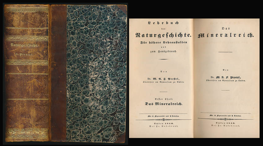 Prestel, Michael August Friedrich: Lehrbuch der Naturgeschichte für höhere Lehranstalten und zum Hausgebrauch. Erster Theil: Das Mineralienreich. Mit 1 Figurentafel und 2 Tabellen. Zweiter Theil: Das Pflanzenreich nach Oken. Dritter Theil: Das Thierreich nach Oken. Mit 1 Figurentafel. 3 Bände (in 1=komplett). Emden, Fr. Rakebrand, 1840-1843. Groß-8°. 23,5 cm. VI, 137, X, 268, VI und 241 Seiten. Halblederband mit goldgeprägtem Rückentitel, marmoriertem Bezugspapier und gelbem Rundumschnitt.
