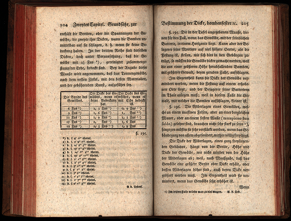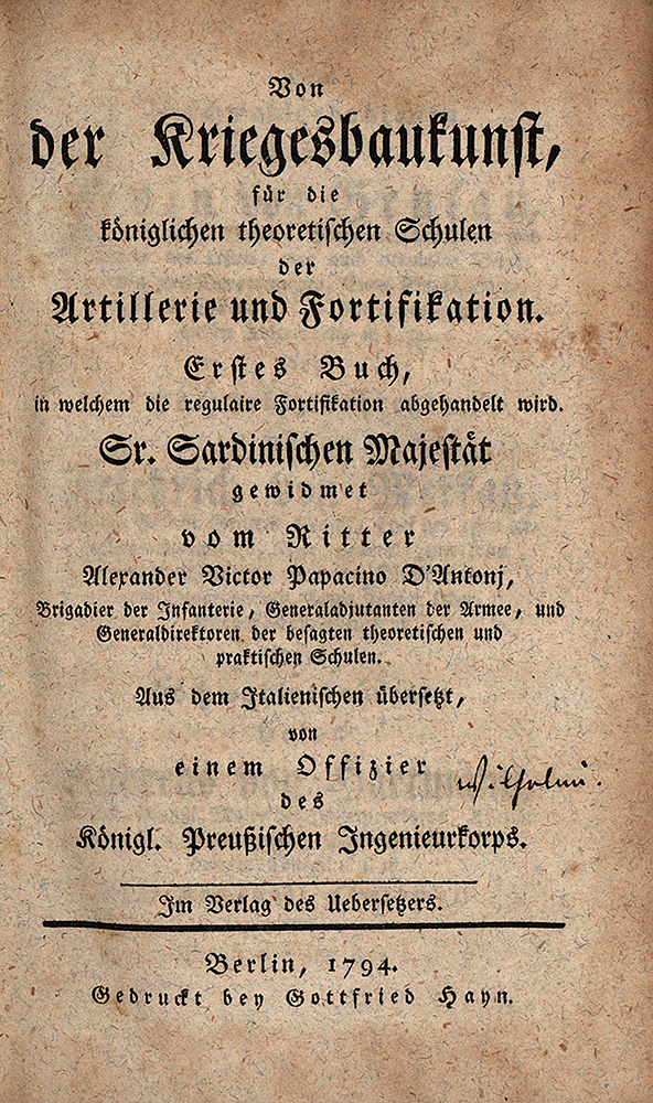 Papacino d’Antoni, Alessandro Vittorio: Von der Kriegesbaukunst, für die königlichen theoretischen Schulen der Artillerie und Fortifikation. Erstes Buch, in welchem die regulaire Fortifikation abgehandelt wird [= alles Erschienene]. Berlin, Im Verlag des Übersetzers, 1794. Klein-8°. 18 x 11 cm. [6] Blatt, XXX, 240 Seiten, [4] Blatt. 23 Falttafeln. Ganzlederband der Zeit mit goldener, floraler Rückenprägung und Rundum-Rotschnitt.