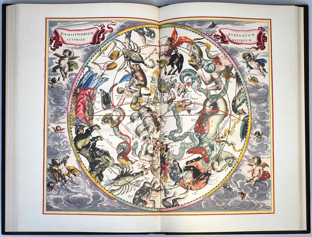 Cellarius, Andreas: Harmonia macrocosmica seu altas universalis novus, totius universi creati cosmographiam generalem, et novam exhibens. Berlin, Coron Verlag, 2006. Groß-2°. 52 x 34 cm. [126], 39 Seiten. Original-Lederband auf 7 Bünden mit papiernem Rückenschild, ornamentaler Goldprägung und gepunztem Rundum-Goldschnitt.