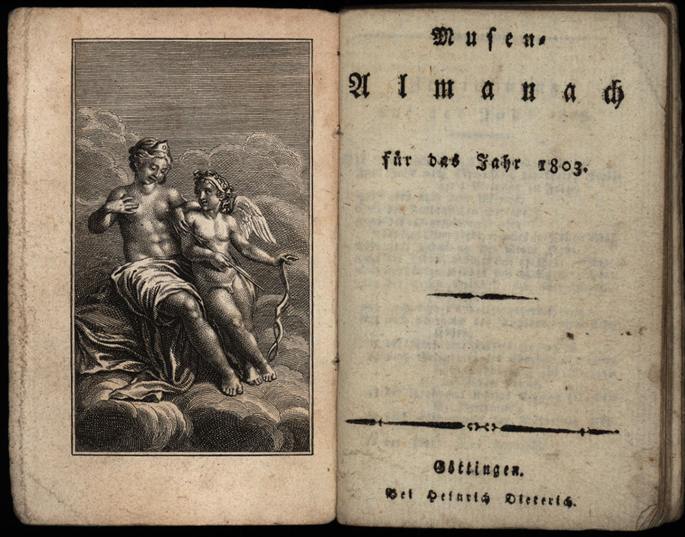 Reinhard, Karl [Hrsg.]: Musen-Almanach für das Jahr 1803. Göttingen, Verlag Heinrich Dieterich, [1802]. 16°. 10,5 x 7 cm. 200, (4) Seiten. Illustrierte Original-Broschur mit illustrierten Vorsätzen.