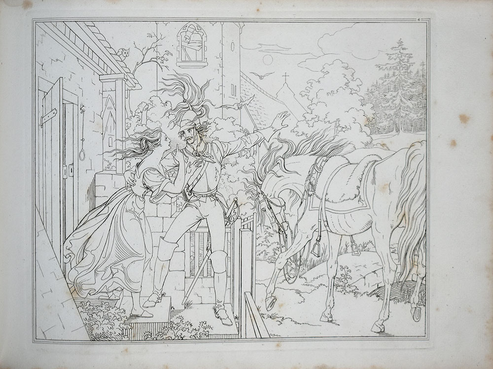 Insgesamt 137 Original-Umrissradierungen auf Tafeln von Moritz Retzsch. Darin: 1) Sechzehn Umrisse zu Schiller’s Kampf mit dem Drachen. Stuttgart, 1837. 16 Seiten. 16 Tafeln. 2) Acht Umrisse zu Schiller’s Fridolin oder der Gang nach dem Eisenhammer. ibidem, 1843. 8 Seiten. 8 Tafeln. 3) Schiller’s Pegasus im Joche. ibidem, 1837. 7 Seiten. 12 Tafeln. 4) Schiller’s Lied von der Glocke. ibidem, 1849. 16 Seiten. 40 Tafeln. 5) Umrisse zu Goethe’s Faust. Erster Theil. ibidem, 1837. 8 Seiten. 29 Tafeln. 6) Umrisse zu Goethes’s Faust. Zweiter Theil. ibidem, 1837. 4 Seiten. 11 Tafeln. 7) Umrisse zu Bürger’s Balladen. Leonore, das Lied vom Mann und des Pfarrer’s Tochter von Taubenhayn. Leipzig, 1840. 8 Seiten, 6 Tafeln; 4 Seiten, 4 Tafeln; 7 Seiten, 5 Tafeln. 8) [Fantasien]. [2] Seiten. s.l., um 1840. 6 Tafeln. Die Werke von Bürger und die Texte in deutscher und englischer, die Fantasien noch zusätzlich französischer Sprache. Einband etwas berieben und an den Kanten stellenweise beschabt, Ecken leicht bestoßen, Bindung vor der letzten Tafel leicht gelockert, Seiten und Tafeln durchweg leicht bis vereinzelt mäßig stockfleckig. Insgesamt gutes Exemplar.