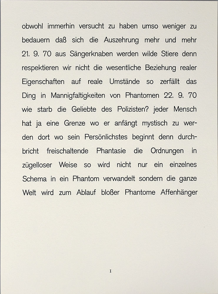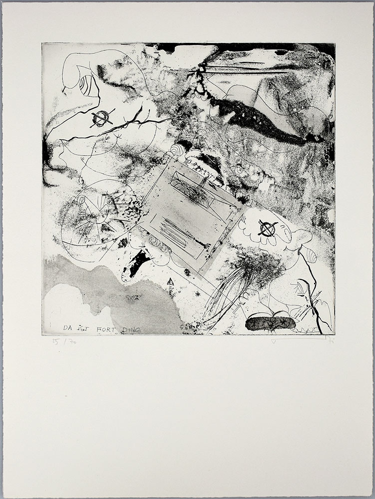 Nummer 35 von 70 Exemplaren (Gesamtauflage 85 Exemplare inklusive h.c.). Mit 7 in Blei nummerierten und signierten Radierungen von Armin Sandig (Blattgröße: 42 x 31 cm, Plattengröße. 25 x 24,5 cm), davon 3 teilkoloriert, zu 13 Texten von Helmut Heißenbüttel. Die typografische Gestaltung übernahm Willie Lindhorst, den Druck Henner Kätelhön. Tadelloses Exemplar.