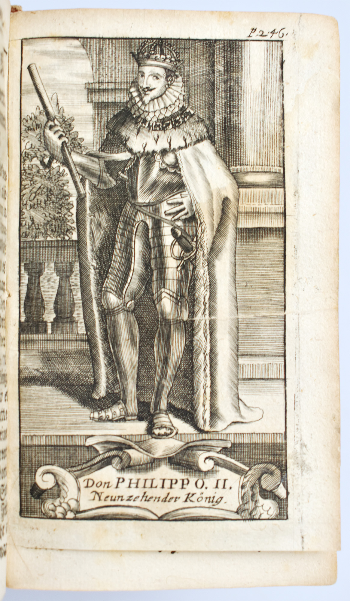 VD17 39:131056B. Mit gestochenem Frontispiz und 24 weiteren Kupfertafeln (die portugiesischen Könige und das alte Wappen Portugals zeigend). Geschichte der königlichen Sukzession in Portugal, ausgehend von Dom Henrique de Borgonha bis auf Dom Pedro II. Bezugspapier und Ecken der Holzdeckeln mit Fehlstellen, Exlibris aus der ersten Hälfte des 20. Jahrhunderts auf fliegendem Blatt, Papier leicht gebräunt bzw. blass stockfleckig, einzelne Seiten und Tafeln mit blassem Wasserrand (zum Teil mit Bild- und Textberührung), Seite 269/70 vermutlich papierbedingt mit Einriss (mit Textberührung, ohne Verlust), insgesamt gutes Exemplar.