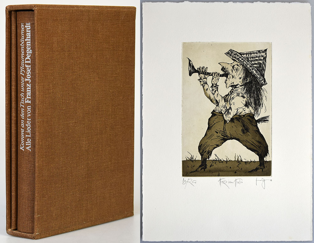 Degenhardt, Franz Josef und Degenhardt, Gertrude: Kommt an den Tisch unter Pflaumenbäumen. Alle Lieder von Franz Josef Degenhardt. Mit Zeichnungen von Gertrude Degenhardt. [Vorzugsausgabe mit signierter Original-Radierung]. Frankfurt am Main, Verlag Büchergilde Gutenberg, 1979. Groß-8°. 28,5 x 20,5 cm. [185] Blatt. Original-Leinenband. Original-Leinenschuber.