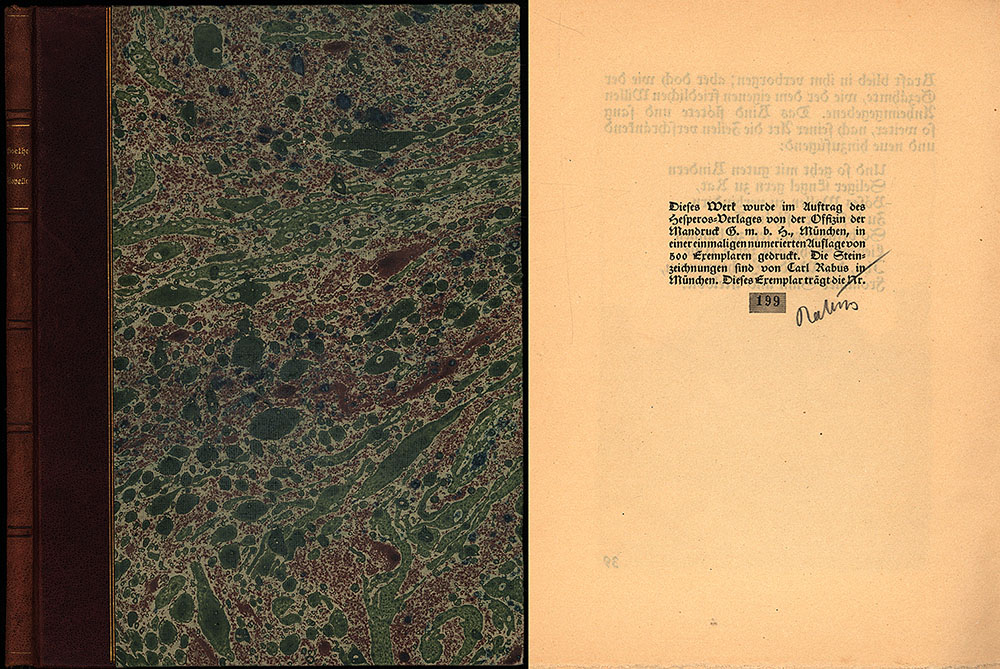 Goethe, Johann Wolfgang von – Rabus, Carl: Die Novelle. Mit 10 Steinzeichungen von Carl Rabus. [Signiertes Exemplar mit Original-Lithografien]. München, Hesperos-Verlag, 1920. Groß-8°. 26,5 x 20 cm. 39 Seiten. Original-Halblederband auf 5 Bünden mit goldgeprägtem Rückentitel, goldgeprägten Deckelfileten, marmoriertem Deckelbezug und Kopfgoldschnitt.
