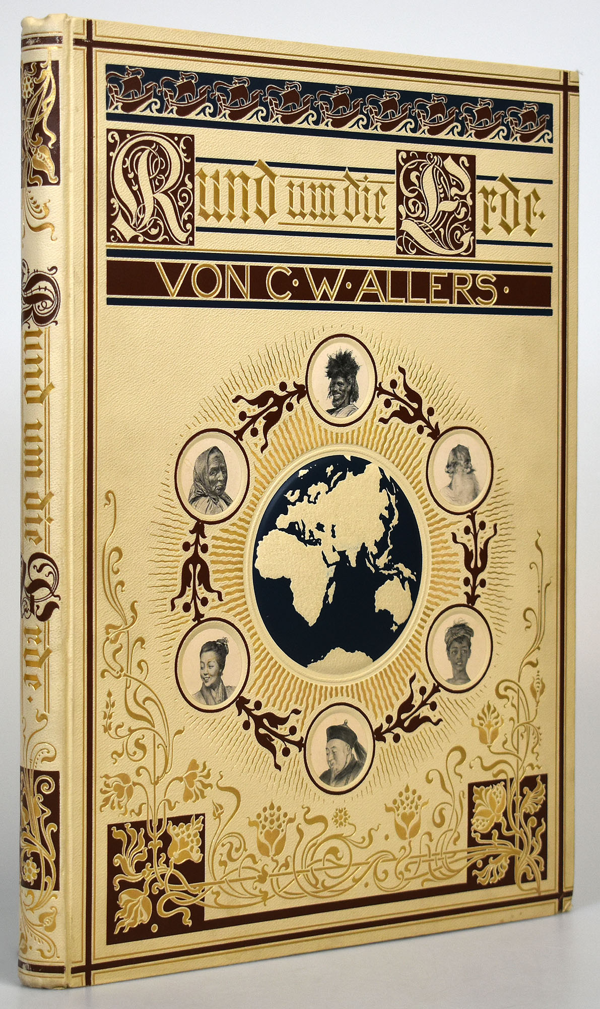 Allers, C.W.: Rund um die Erde. Stuttgart/Berlin/Leipzig, Union Deutsche Verlagsgesellschaft, [um 1895]. Groß-4°. 39 x 29 cm. [4] Blatt, 179, [5] Seiten. Illustrierter Original-Leinenband mit goldgeprägtem Rücken- und Deckeltitel, 6 Porträtabbildungen und einer Erdkugel als Relief auf dem Vorderdeckel, illustrierten Vorsätzen und Rundum-Goldschnitt.