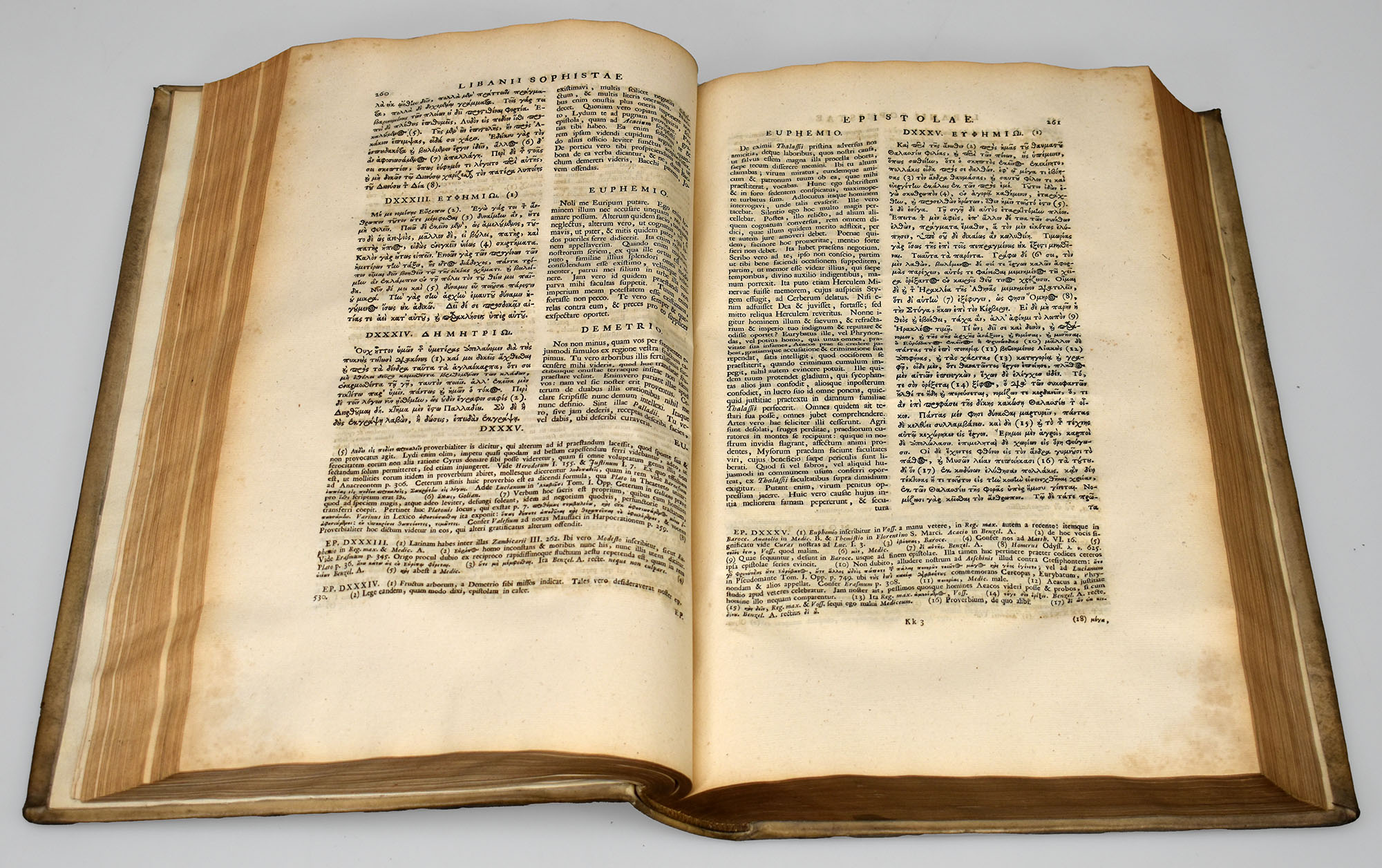 Erste Ausgabe. Zweisprachige Ausgabe in Altgriechisch und Latein. Graesse IV, 195. Brunet III, 1050. Schröder VIII, 148, 46. Ledeboer 176. Mit in Rot und Schwarz gedrucktem Titelblatt, gestochener Titelvignette und einigen Holzschnittvignetten. Mit Anmerkungsapparat je am Fuß der Seite. Bei Smith als beste Ausgabe angegeben und die Briefe als äußerst interessant hervorgehoben, da sie an Männer wie Kaiser Julian, Athanasius, Basilius, Gregor von Nyssa und Chrysostomus gerichtet seien (A Classical Dictionary of Greek and Roman, Seite 487). Die Sammlung beinhaltet auch die Fälschungen des Venezianers Francesco Zambeccari. Altgriechischer Text und lateinische Übersetzung in zweispaltigem Druck als Paralleltext gesetzt. Einband berieben, leicht bestoßen und mit einzelnen kleinen Fehlstellen im Pergamentbezug, vorderer Außenfalz eingerissen (ca. 12 cm, Bindung jedoch fest), Seiten gering gebräunt, stellenweise leicht stockfleckig und sehr vereinzelt leicht staubschmutzig, Vakatblatt vor dem Vortitel entfernt, ansonsten gutes bis sehr gutes Exemplar.
