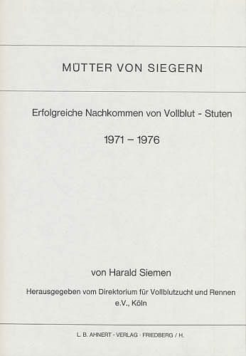 Siemen, Harald: Mütter von Siegern. Erfolgreiche Nachkommen von Vollblut-Stuten, 1971 – 1976. Herausgegeben vom Direktorium für Vollblutzucht und Rennen e.V. Friedberg, L. B. Ahnert-Verlag, 1978. 4°. 30,5 cm. 288 Seiten. Original-Kunstlederband mit goldgeprägtem Rückentitel.
