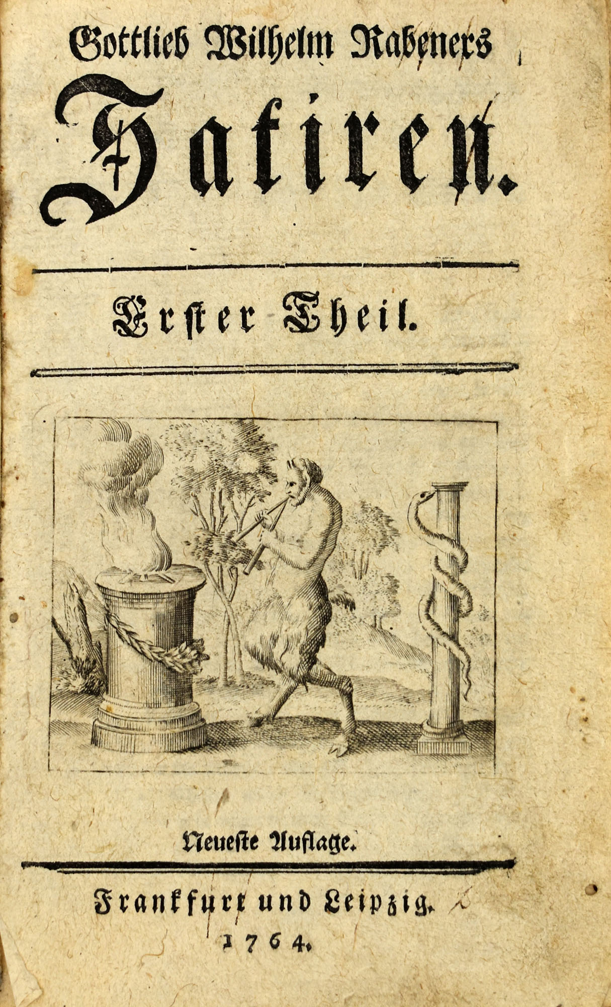 Rabener, Gottlieb Wilhelm: Gottlieb Wilhelm Rabeners Satiren. 4 Teile (in 1 Band, komplett). Frankfurt/Leipzig, [Dyck Verlag], 1764. 8°. 19,5 x 13 cm. 176, 190, 304, 411 Seiten. Halblederband der Zeit auf 4 Bünden mit blauem Sprengschnitt.