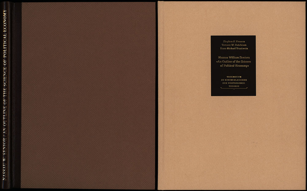 Senior, Nassau William: An outline of the science of political economy. Beiliegend Kommentarband: Frowen, Hutchison, Trautwein, Nassau William Seniors „An Outline of the Scinece of Political Economy“. Vademecum zu einem Klassiker der Verteilungstheorie. Düsseldorf, Verlag Wirtschaft und Finanzen, 2000. 4°. 27,5 x 21,5 cm. Seite 129-224, 1 Blatt. Kommentarband 95 Seiten. Original-Halblederband. Kommentarband als Pappband. (Klassiker der Nationalökonomie).
