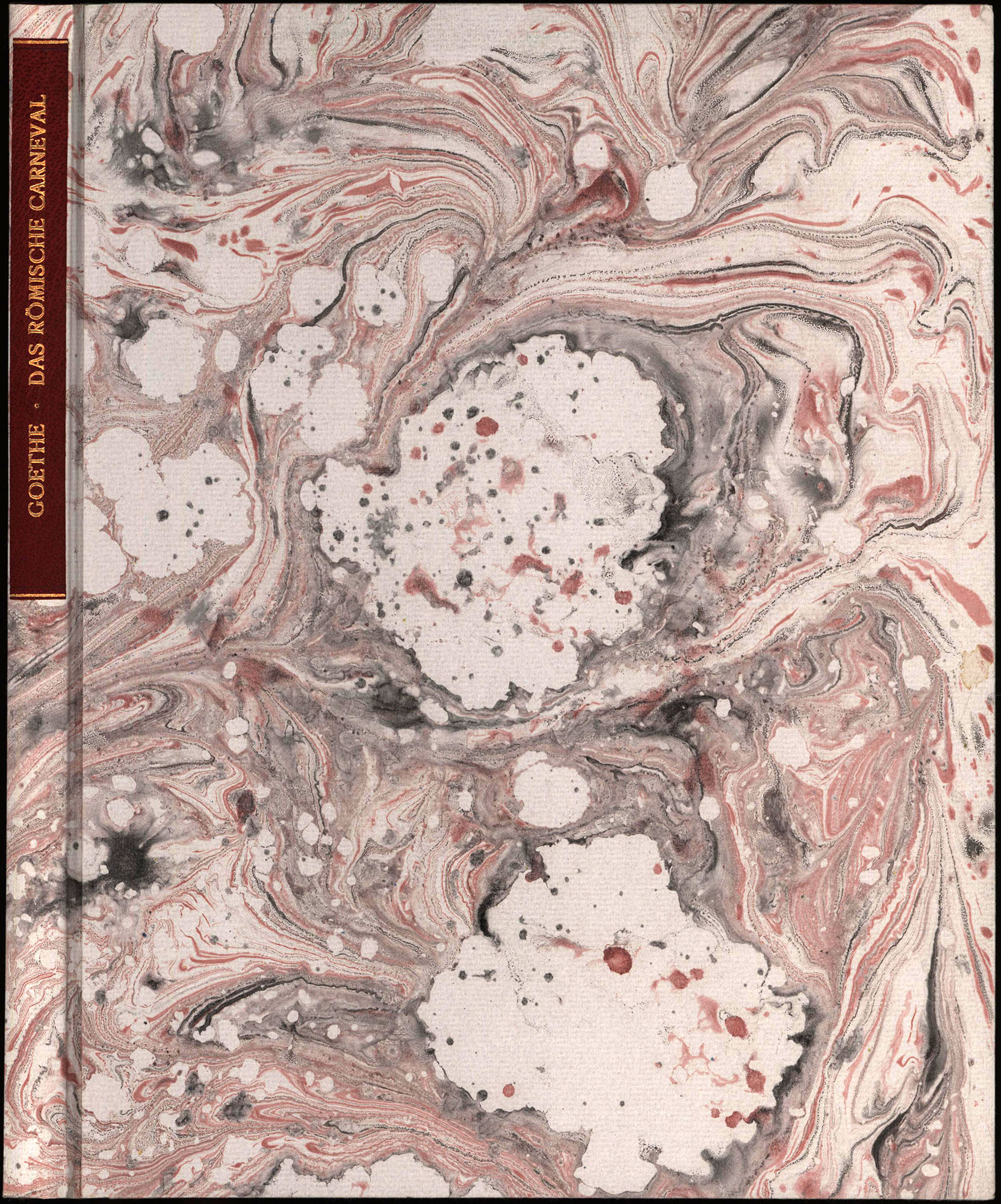 Goethe, Johann Wolfgang von: Das römische Carneval. Leipzig, Insel-Verlag, 1965. 4°. 29,5 x 24 cm. 69 Seiten, (1) Blatt. 20 Farbtafeln. Marmorierter Pappband mit goldgeprägtem Titel auf Lederrückenschildchen.