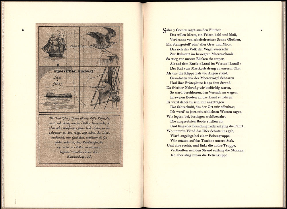 Chamisso, Adelbert von – Quadflieg, Roswitha: Salas y Gomez. [Signiertes Exemplar]. Mit den Tagebucheintragungen, Salas y Gomez betreffend, aus dem zweiten Theil der „Reise um die Welt“ mit der Romanzoffischen Entdeckungs-Expedition in den Jahren 1815 – 1818 auf der Brigg Rurik unter Kapitän Otto v. Kotzebue. Versehen mit allerlei Bildern von Roswitha Quadflieg. Zum 200. Geburtstag des Verfassers. Hamburg, Raamin-Presse, 1981. 4°. 29,5 x 20 cm. 27 Seiten. Hellbrauner Original-Halblederband im Original-Pappschuber. (= 12. Druck der Raamin-Presse Hamburg).