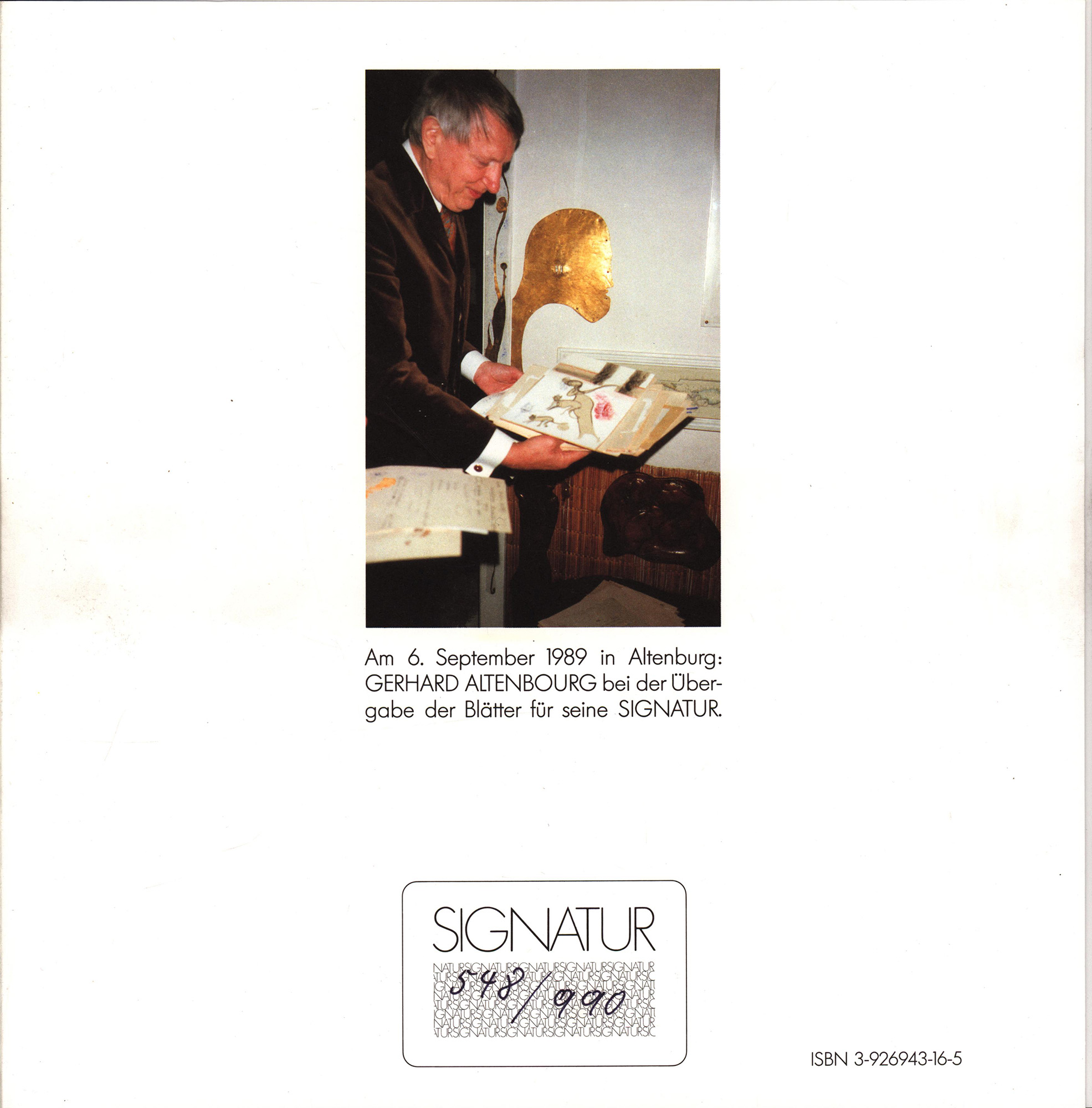 Altenbourg, Gerhard: Signatur. Zeit. Schrift. Bild. Objekt Nr. 13. Remagen-Rolandseck, Verlag Rommerskirchen, 1990. 4°. 30 cm. [32 Seiten.] Original-Karton in Blockbuchform in Original-Plexiglasschuber mit Aufhänger. (= Signatur, Band 13).