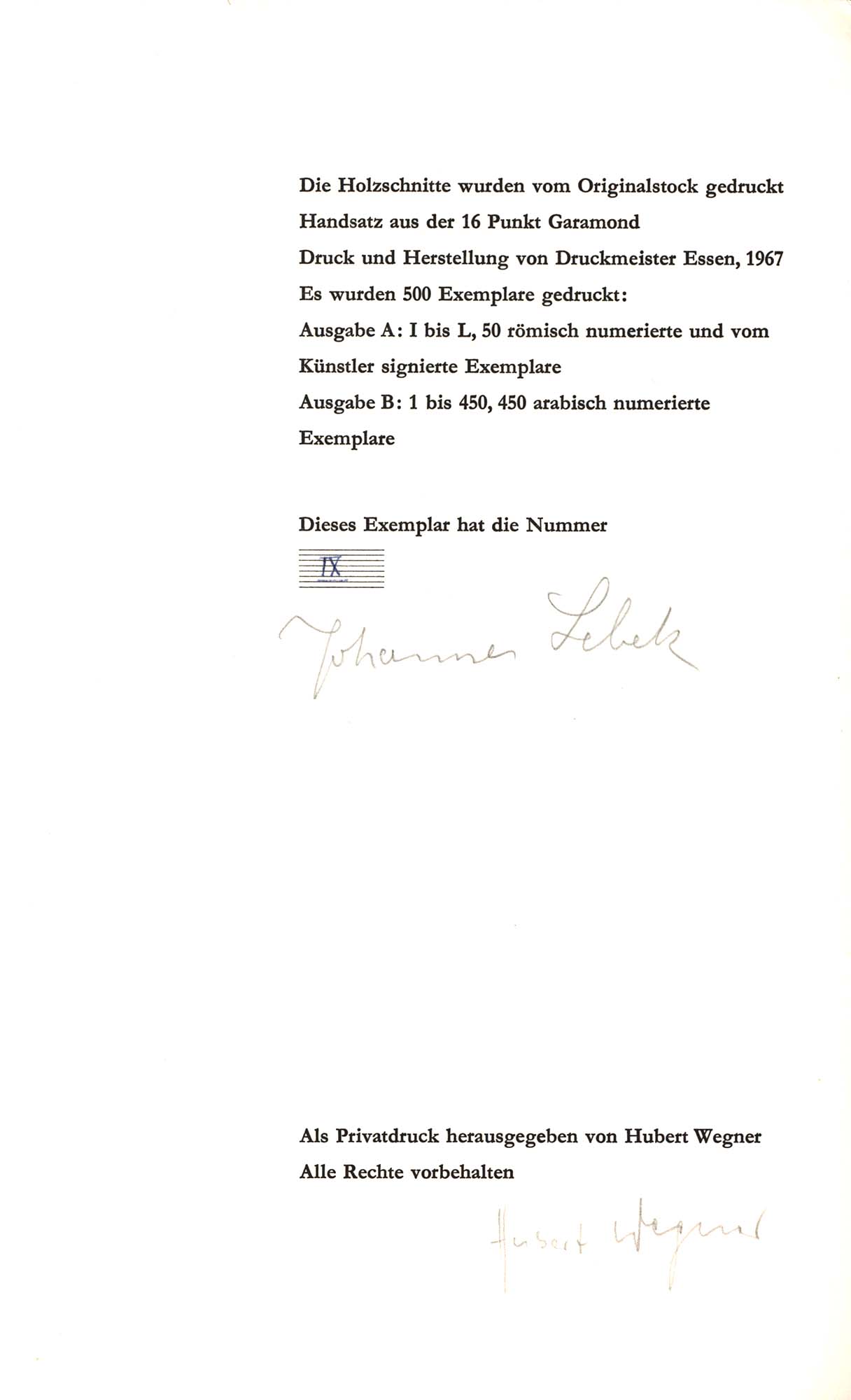 Nummer IX von 50 (insgesamt 500) römisch nummerierten und vom Künstler signierten Exemplaren, zusätzlich vom Herausgeber signiert. Sehr gutes Exemplar.