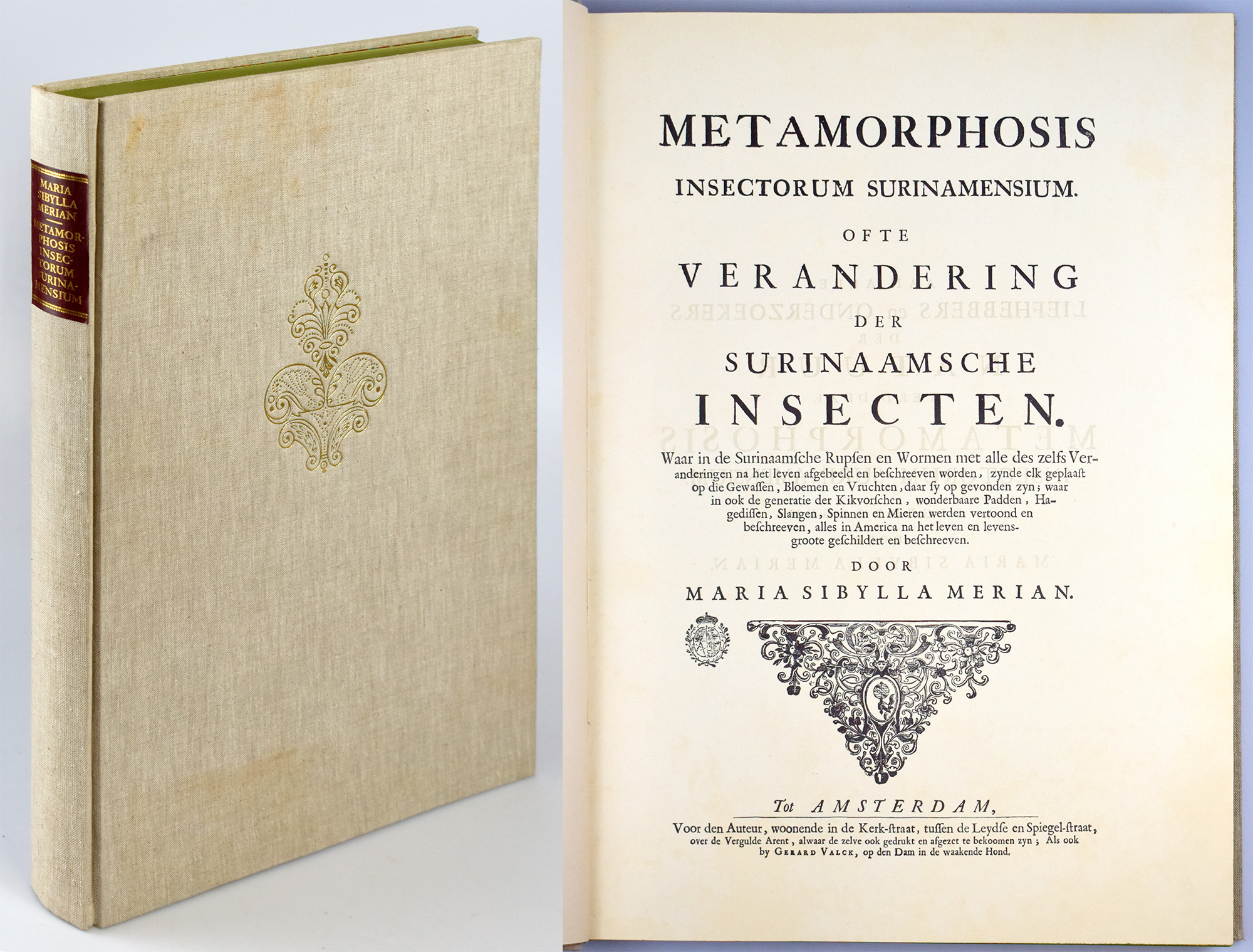 Merian, Maria Sibylla: Metamorphosis insectorum Surinamensium. [Faksimileband]. Leipzig, Insel-Verlag, 1975. 2°. 50,5 x 36 cm. [2], 60, [1] Blatt. 60 Tafeln. Original-Leinenband mit goldgeprägtem Titel auf ledernem Rückenschild und Rundum-Grünschnitt.