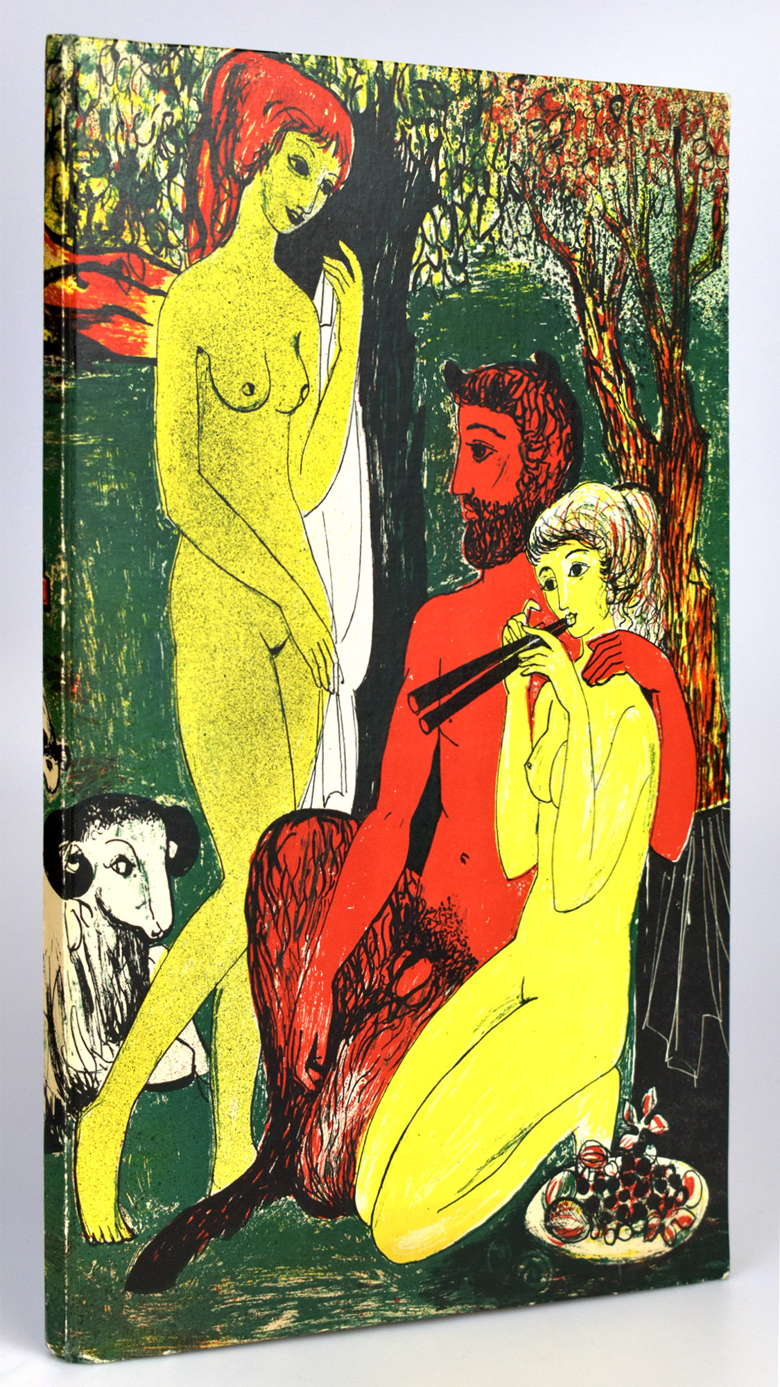 Krumsdorf, Edwin und Weidenhaus, Elfriede: Das Lachen des großen Pan. Illustriert mit 8 Original-Lithographien von Elfriede Weidenhaus. [Mit Original-Zeichnung]. Wiesbaden, Zikaden-Presse, 1959. 2°. 45 x 30 cm. [33] Seiten. Farbig illustrierter Original-Pappband. (= Erster Druck der Zikadenpresse).