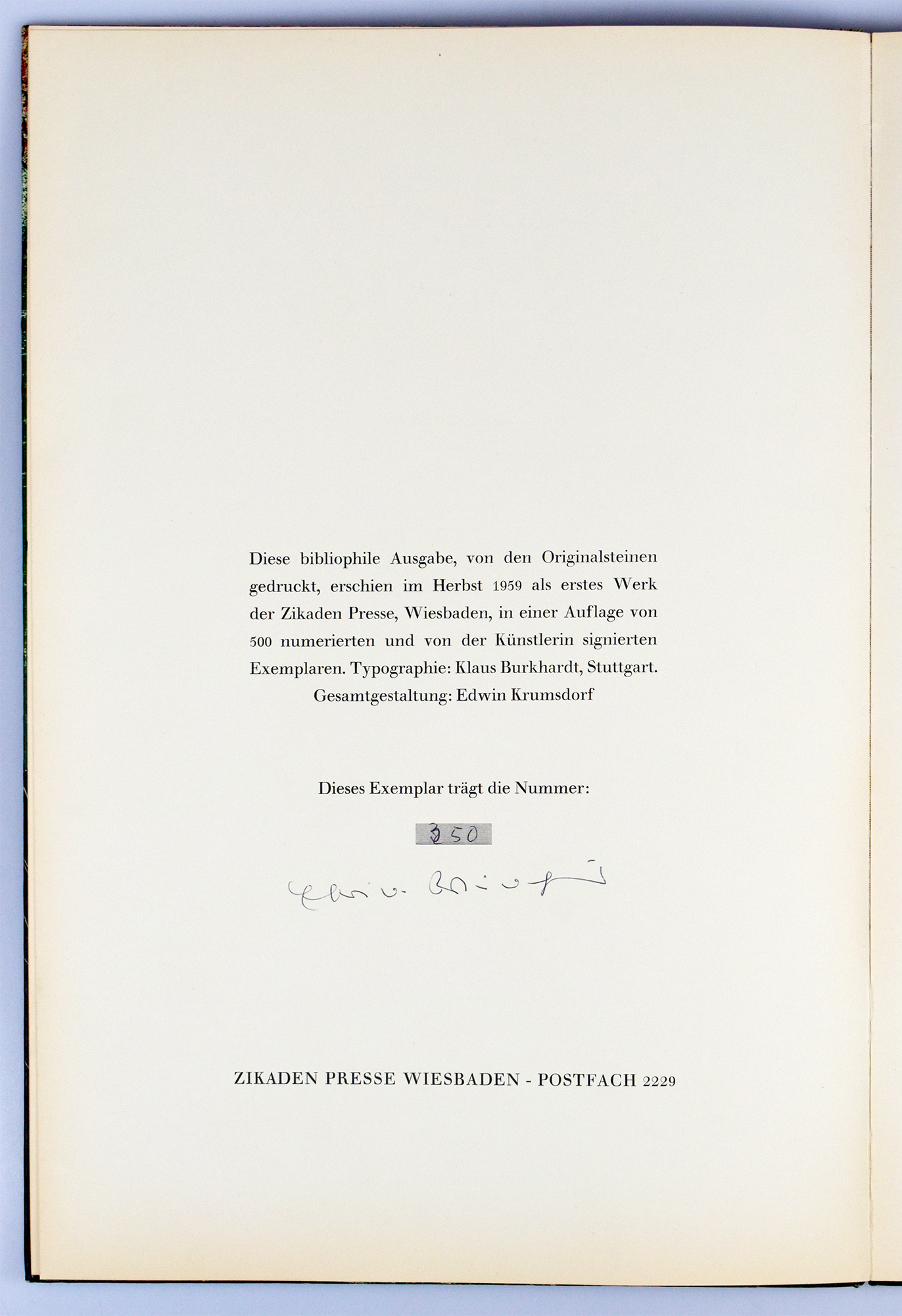 Nummer 350 von 500 handnummerierten und von Elfriede Weidenhaus im Kolophon mit Kugelschreiber signierten Exemplaren. Das vorliegende Exemplare zusätzlich mit signierter aquarellierter Original-Exlibris-Federzeichnung von Elfriede Weidenhaus auf dem Titelblatt (Maße ca. 13 x 11,5 cm). Mit 8 eingebundenen, blattgroßen Original-Lithografien. Einband an den Kanten gering berieben, Seiten minimal gebräunt, ansonsten sehr gutes Exemplar.