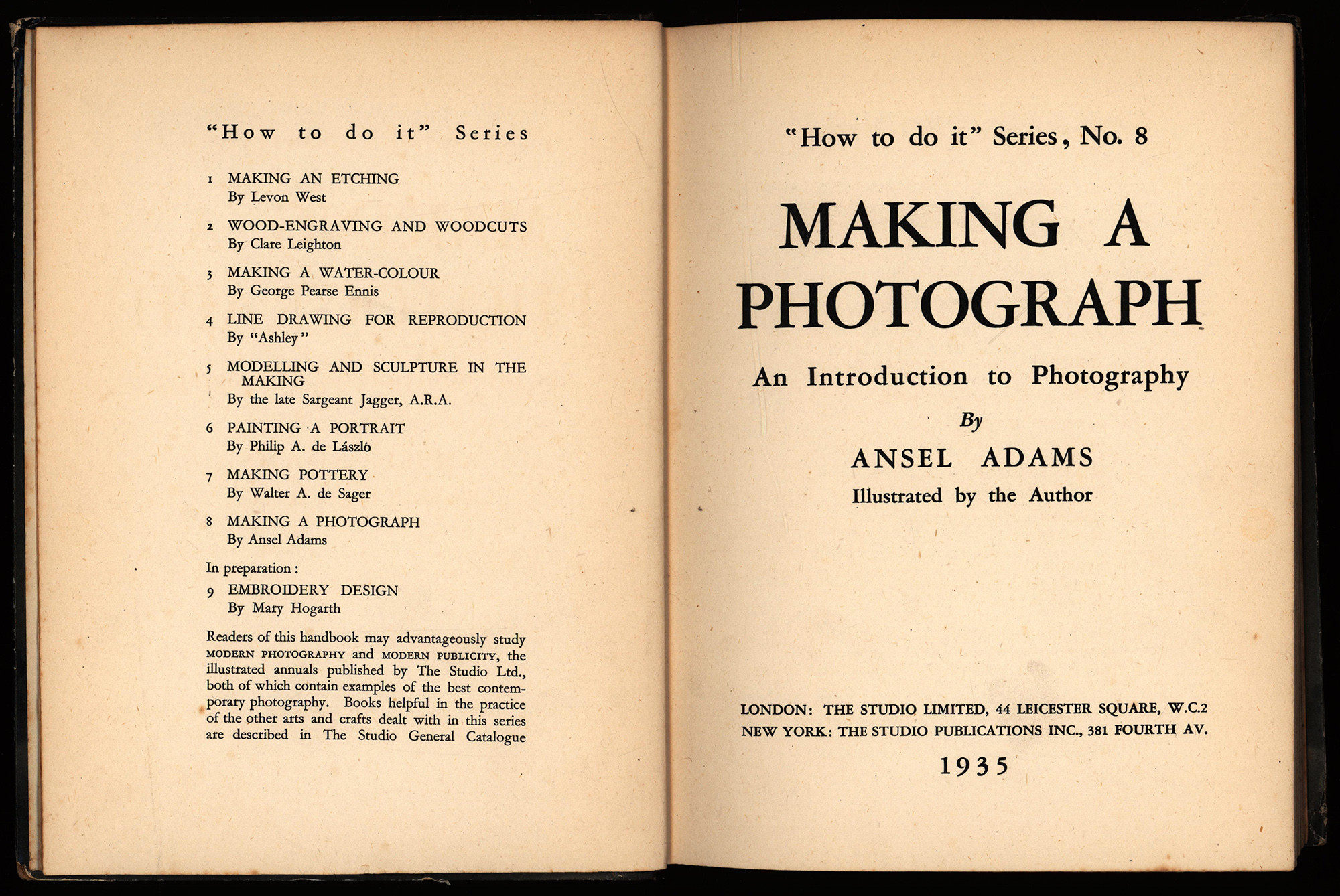 Adams, Ansel: Making a photograph. An introduction to Photography by Ansel Adams. Illustrated by the author. London, The Studio Limited, 1935. 8°. 25,5 x 19 cm. 96 Seiten. Original-Halbleinenband. (= How to do it Series, Nr. 8).