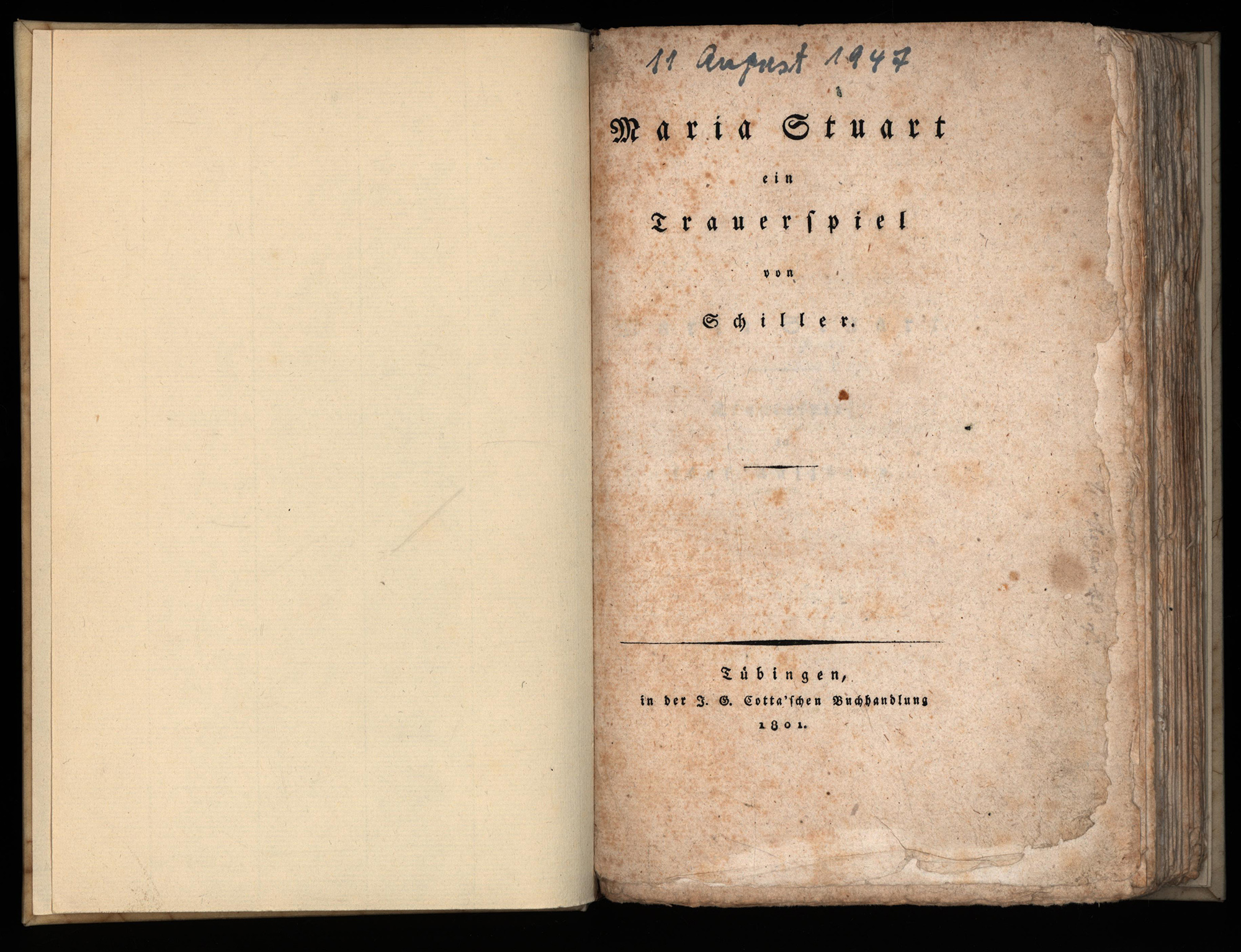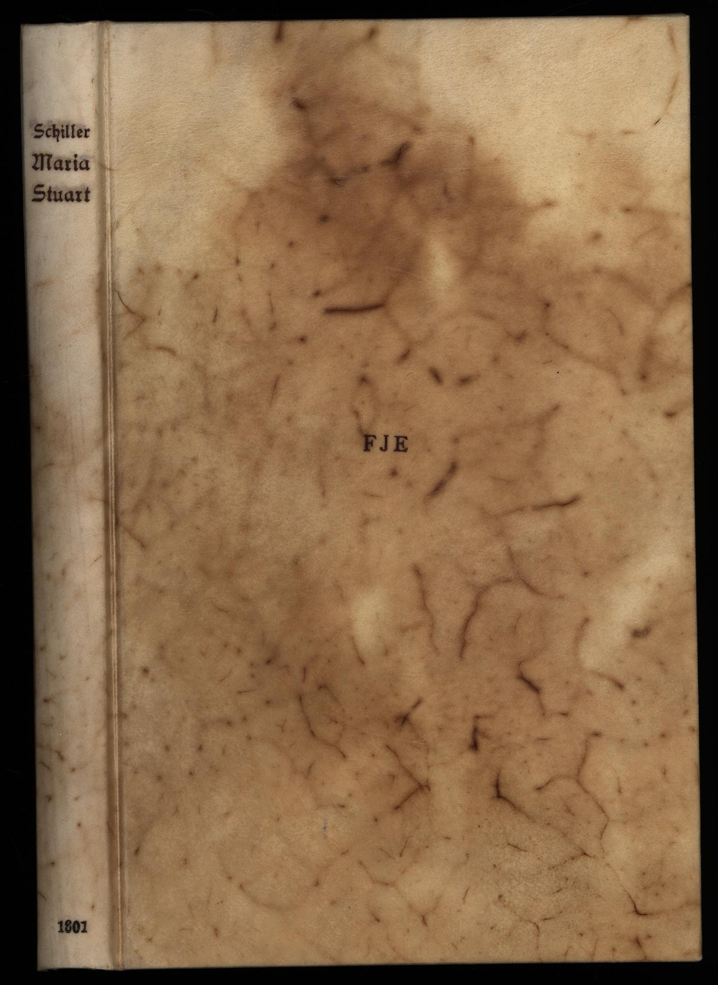 Schiller, Friedrich: Maria Stuart. Ein Trauerspiel. [Erste Ausgabe]. Tübingen, Cotta Verlag, 1801. Groß-8°. 23 x 15 cm. [1] Blatt, 237 Seiten. Handeinband in Pergament von Irmgard Smidt (Buchbindersignet auf Innenkante des Hinterdeckels).